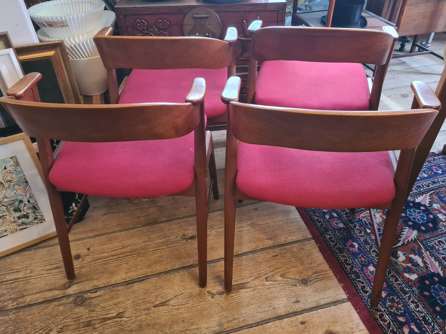 4 spisebordsstole fra 1960'erne designet af Kai Kristiansen. Her i teak med stofbetrukket sæde. Fremstår pæne og velholdte uden nævneværdige brugsspor.