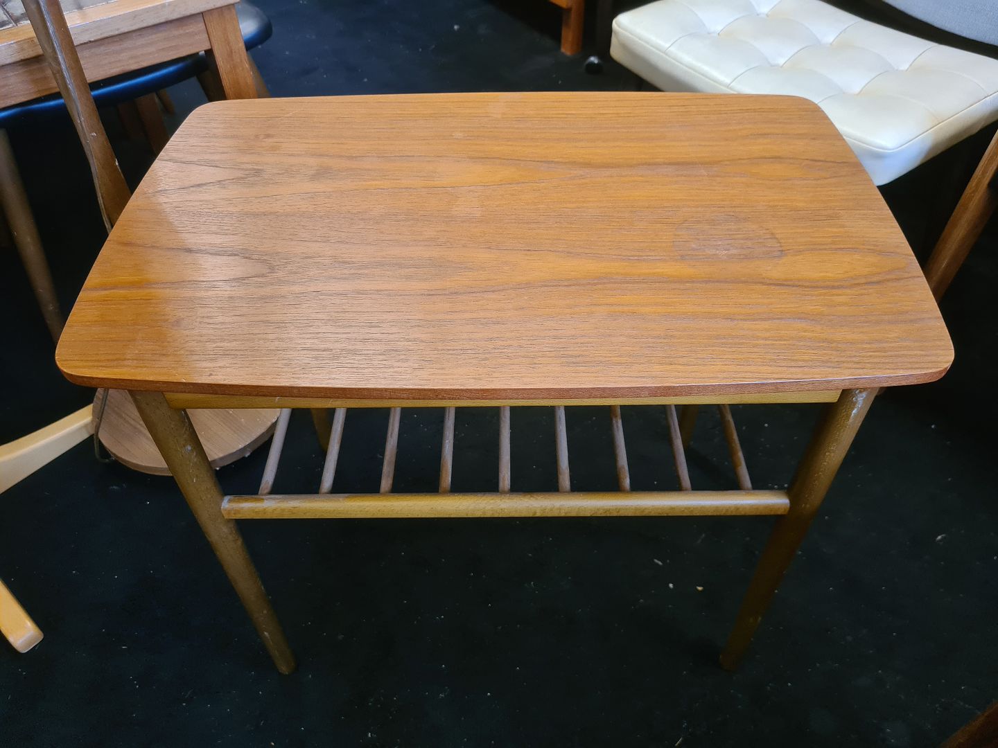 Dansk Design lampebord fra 1960'erne i teak og bøg. Fremstår pænt og stabilt dog med lidt brugsspor på pladen.(Billede)