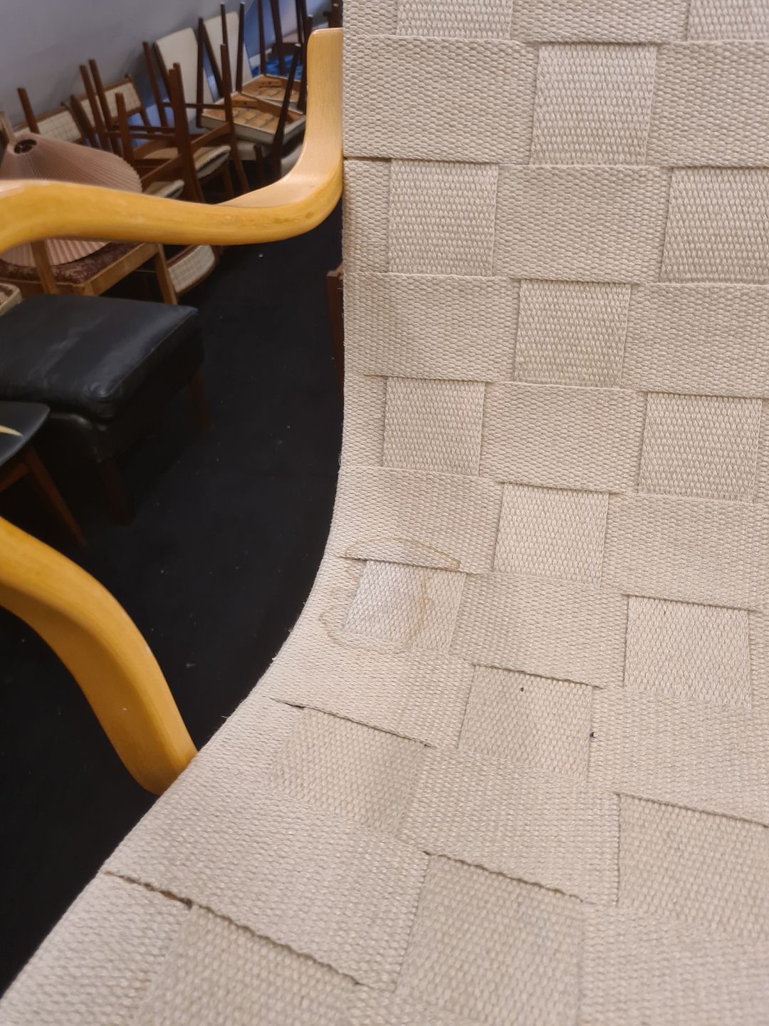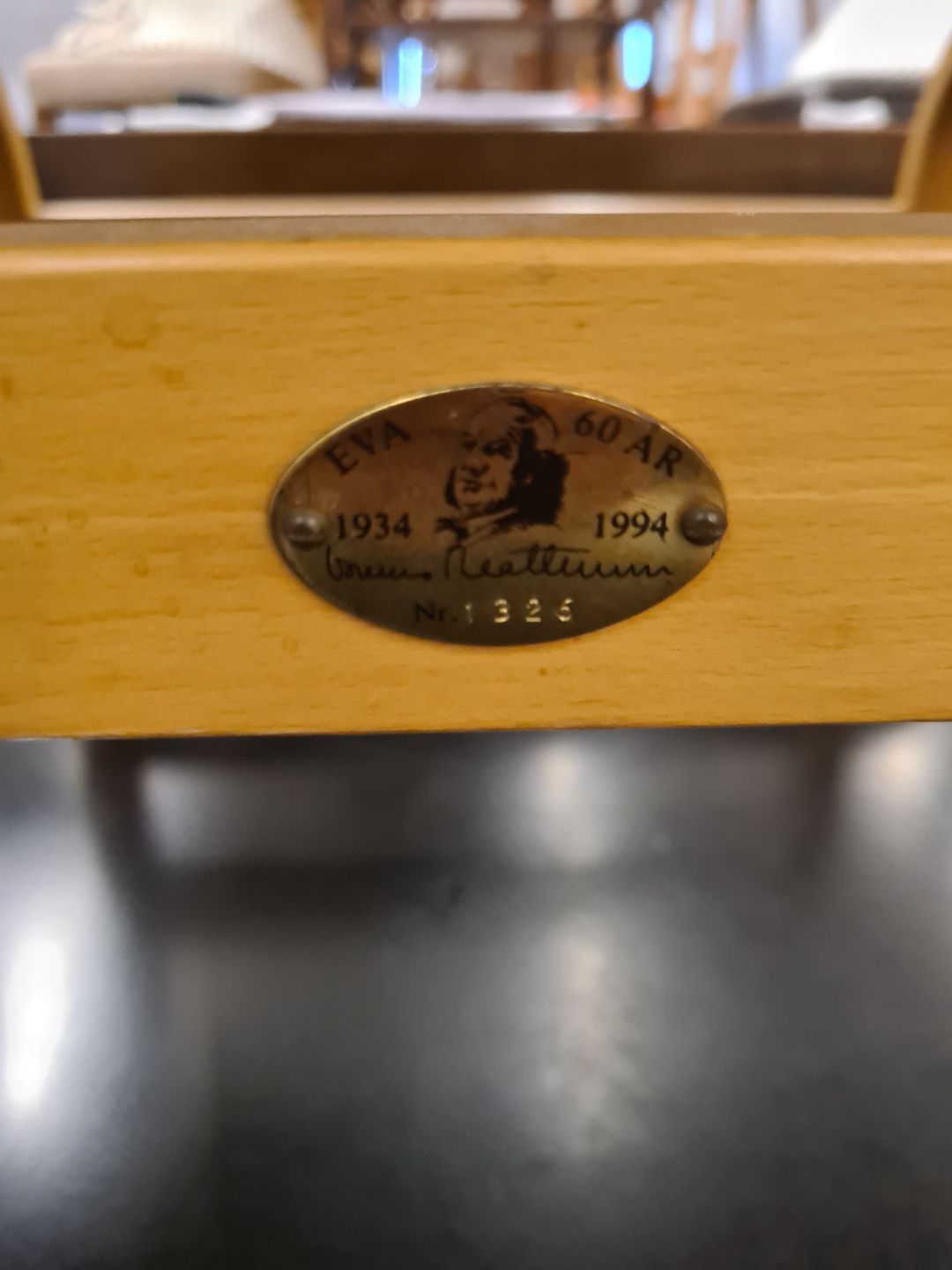 Evastol designet af Bruno Mathsson. Her en model fra 1994 i bøg og kanvasflet. Fremstår god og stabil med enkelte brugsspor på kanvas. (Billede)