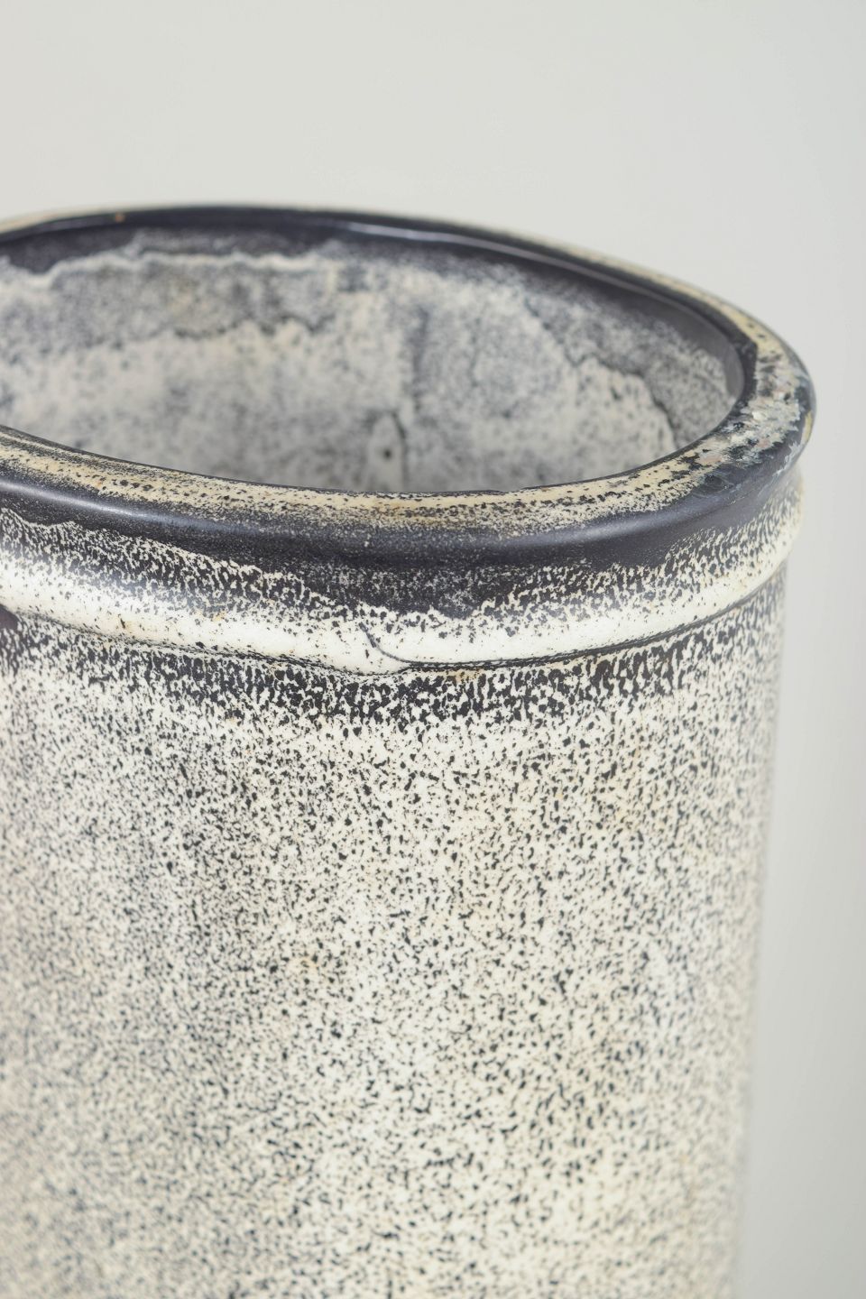 Stor vase i stentøj med cylindrisk form og karakteristisk dobbelt glasur i sorte og grå nuancer med levende, let krakeleret overflade. Et markant eksempel på Hammershøis monumentale formsprog og eksperimenterende glasurarbejde fra 1930’erne. Stemplet i bunden.