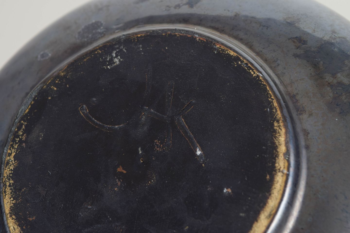 Dekorativ skål i stentøj med enkel, lav form og karakteristisk lustreglasur i mørke nuancer med fine spil i overfladen. Et klassisk eksempel på Hammershøis stilrene formsprog og sikre glasurarbejde fra 1930’erne. Stemplet i bunden.