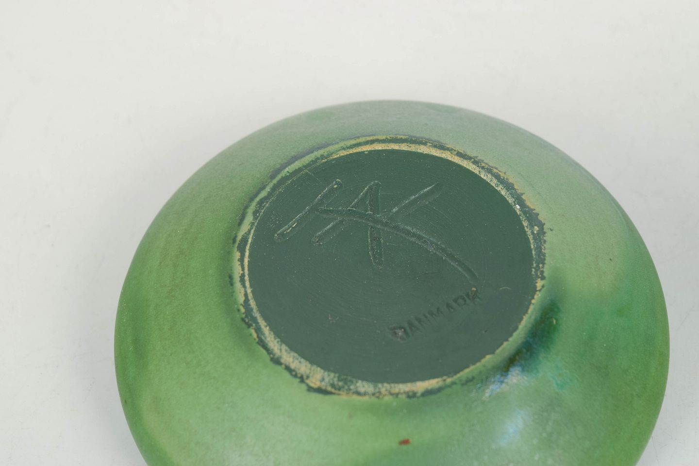 Lille vase og matchende fad i stentøj med enkle former og karakteristiske glasurer i grønne og blå nuancer. Et fint eksempel på Hammershøis stilrene formsprog og eksperimenterende glasurarbejde fra 1930’erne. Stemplet i bunden.
