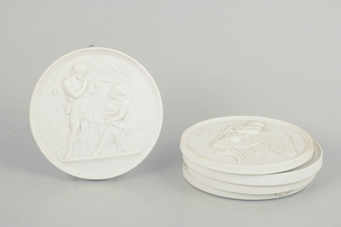 Relieffer i hvidt uglaseret porcelæn med klassiske motiver efter Bertel Thorvaldsen, udført i fin biscuit med detaljeret figurdekoration og ophæng på bagsiden. Første og tredje sortering.