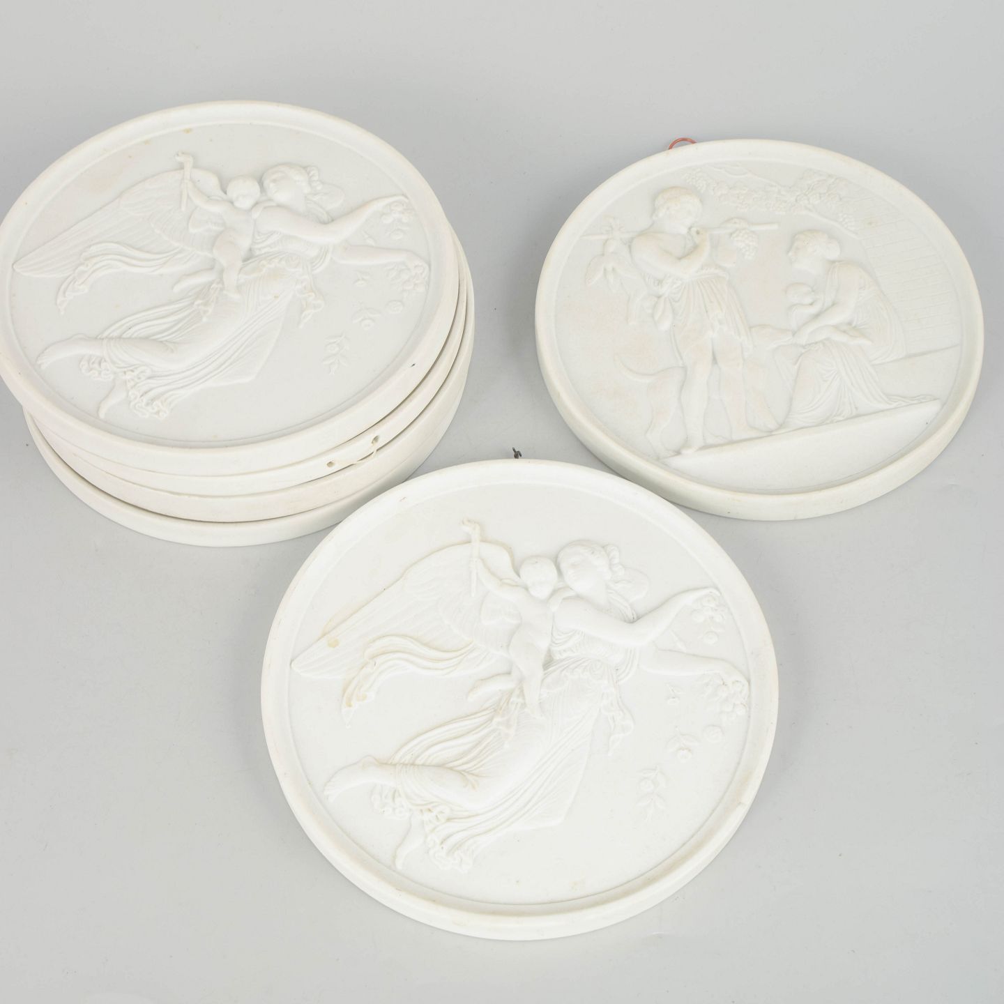 Relieffer i hvidt uglaseret porcelæn med klassiske motiver efter Bertel Thorvaldsen, udført i fin biscuit med detaljeret figurdekoration og ophæng på bagsiden. Første sortering.