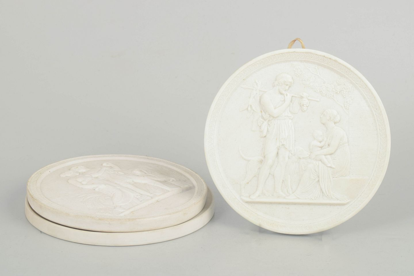 Relieffer i hvidt uglaseret porcelæn med klassiske motiver efter Bertel Thorvaldsen, udført i fin biscuit med detaljeret figurdekoration og ophæng på bagsiden. Første sortering.