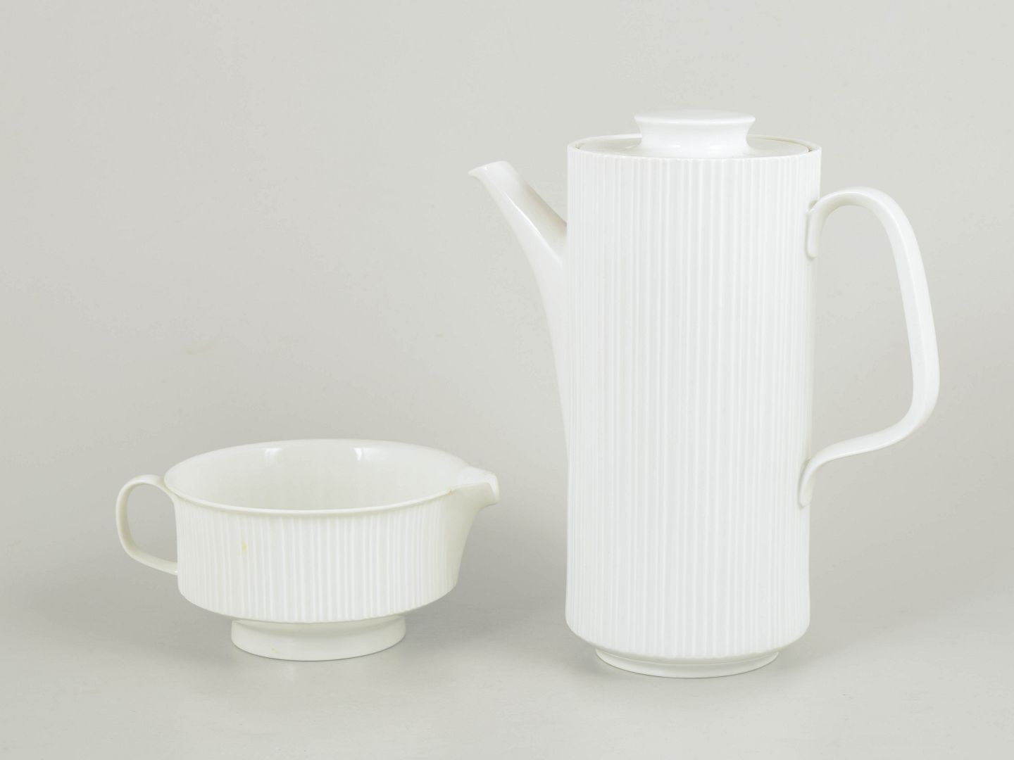 Elegant sæt bestående af kaffekande og flødekande i porcelæn med enkle linjer og funktionalistisk formsprog, karakteristisk for Tapio Wirkkalas arbejde for Rosenthal i 1980’erne.