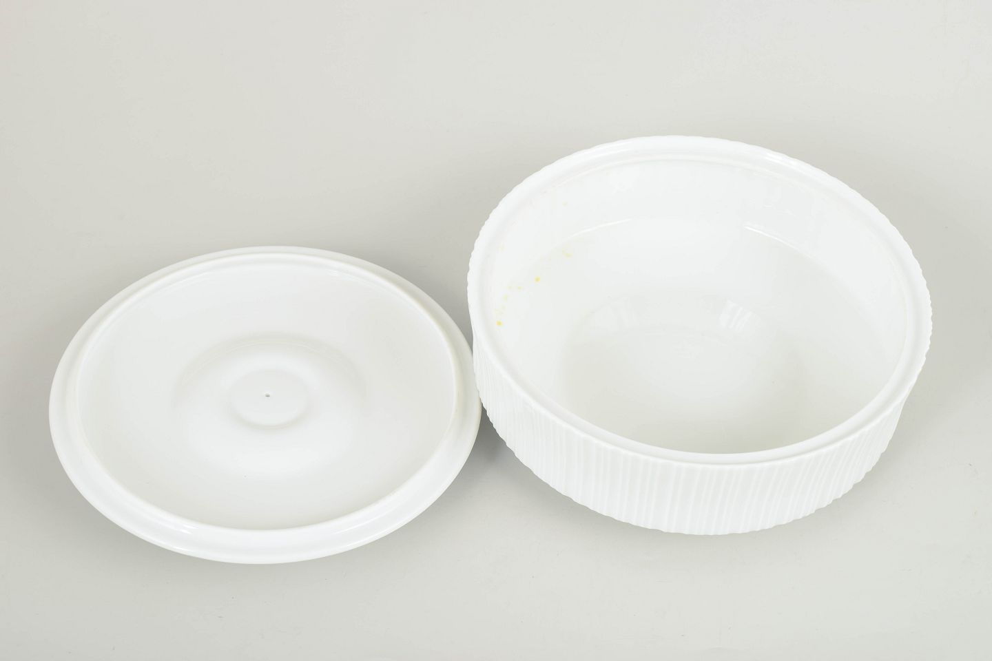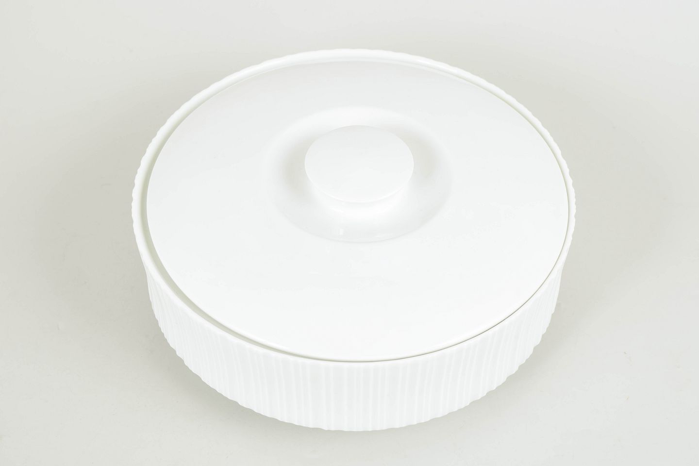 Rund skål med låg i porcelæn med lodrette rifler og et stramt, funktionalistisk formsprog, typisk for Tapio Wirkkalas arbejde for Rosenthal i 1980’erne.