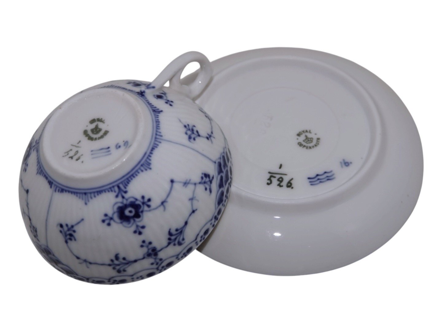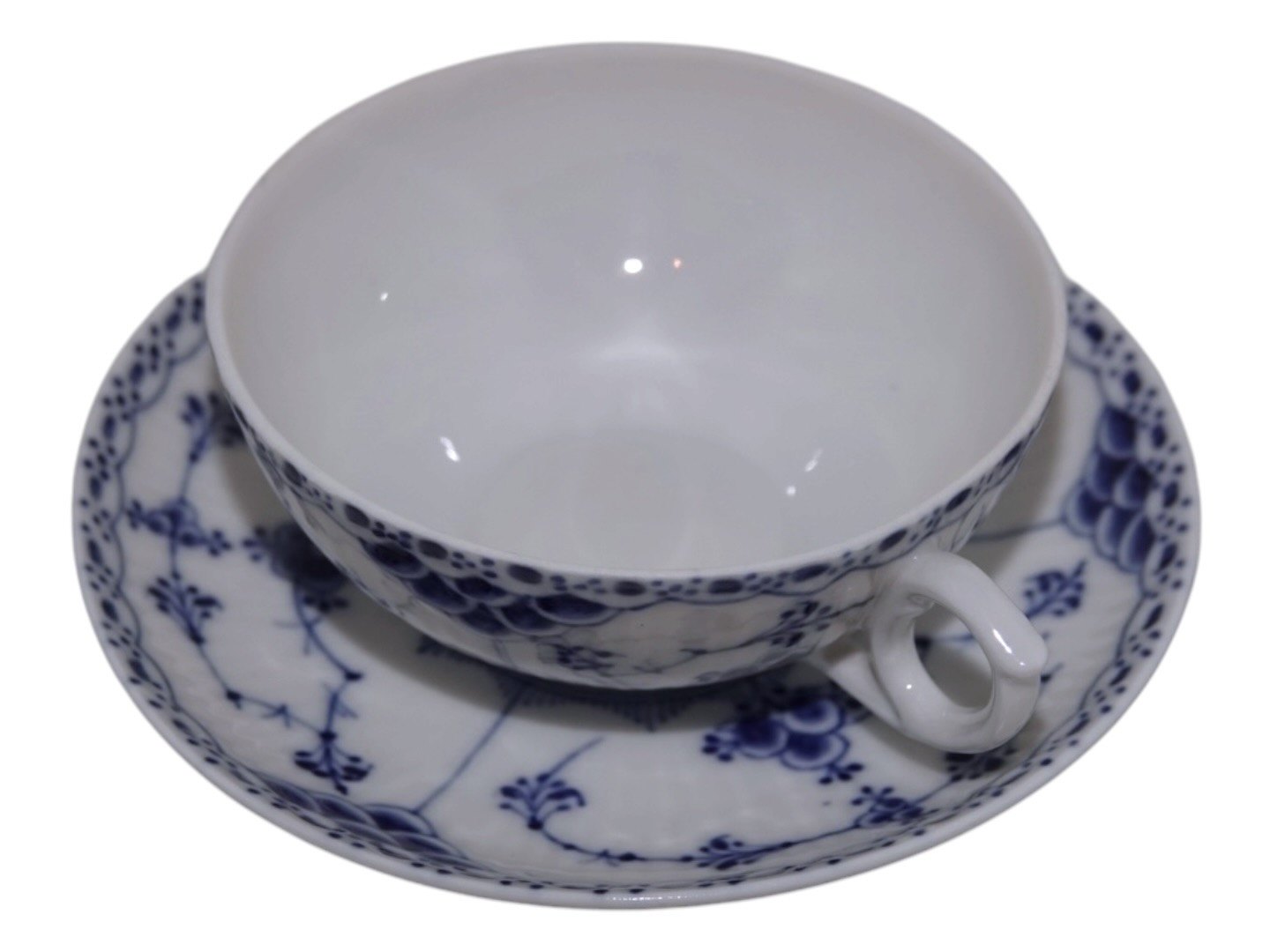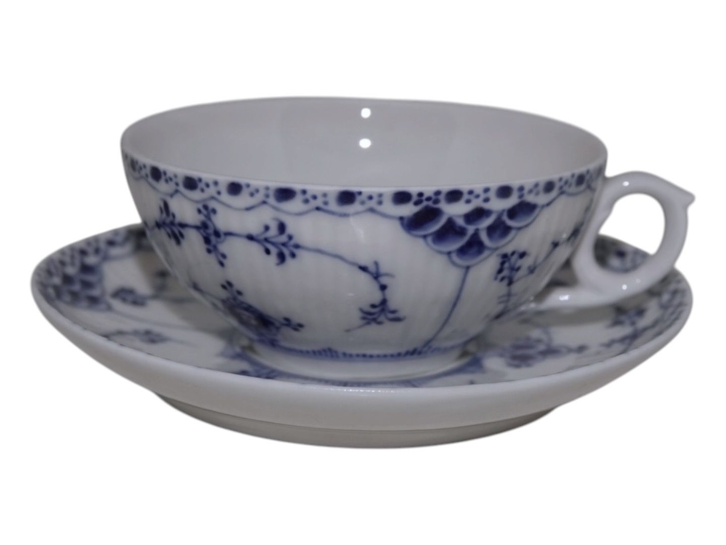 Royal Copenhagen Blue Fluted Half Lace, small cup with matching saucer.