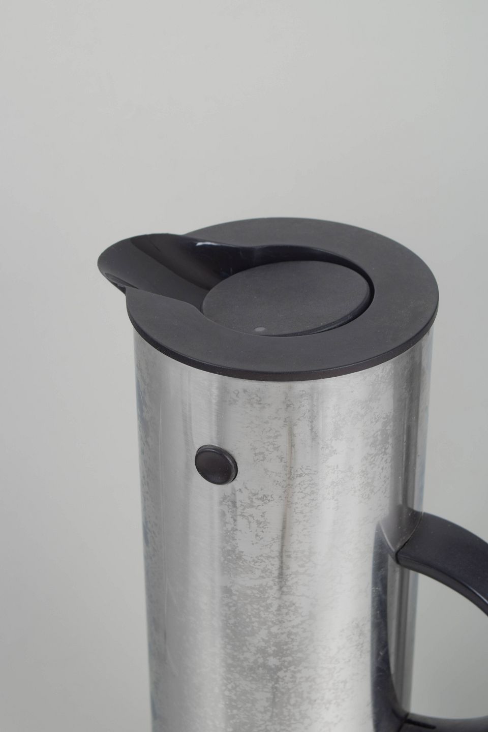 Two cylindrical vacuum coffee pots in brushed stainless steel with the characteristic tilt-top stopper and black plastic handle. A model from Stelton’s iconic series, designed with a focus on functionality and minimalist aesthetics.