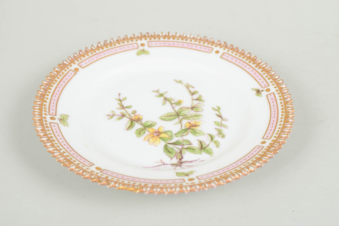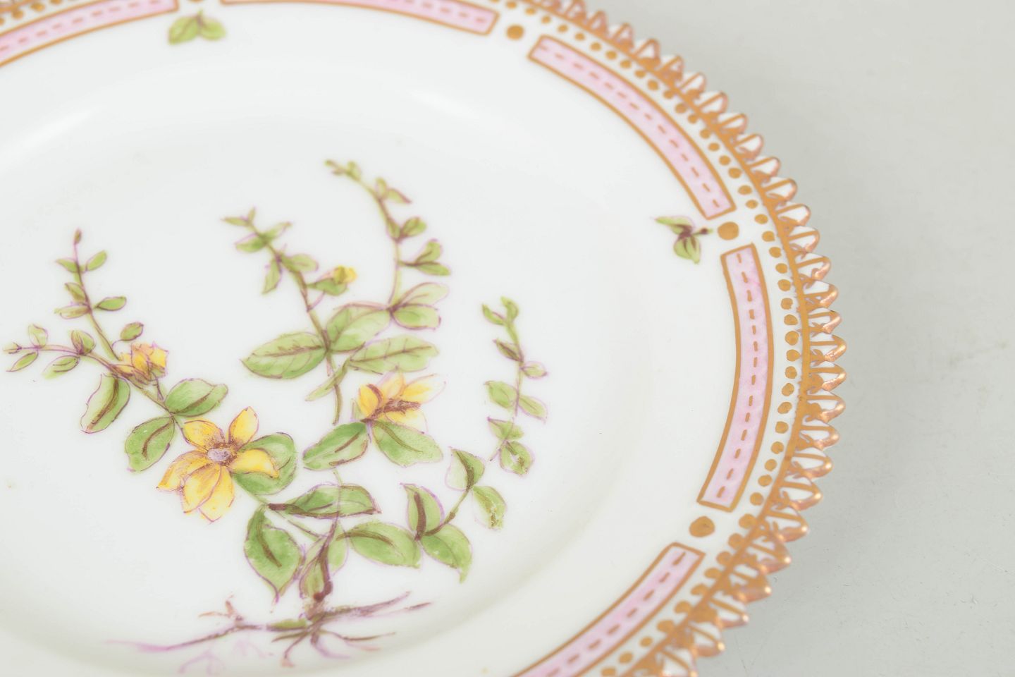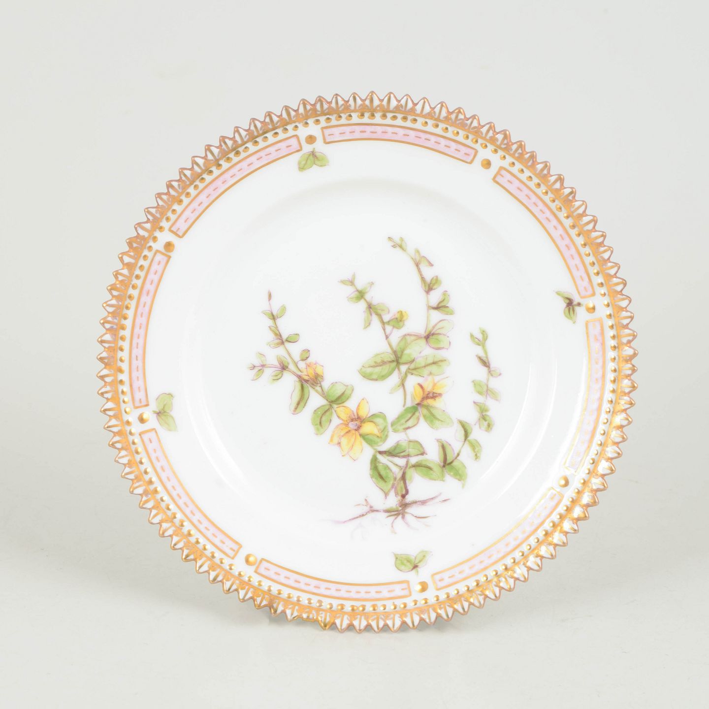 Hånddekoreret porcelænstallerken med botanisk motiv fra Flora Danica-serien, hjemmedekoreret, fint udført med forgyldt rand og detaljerig gengivelse af planter.