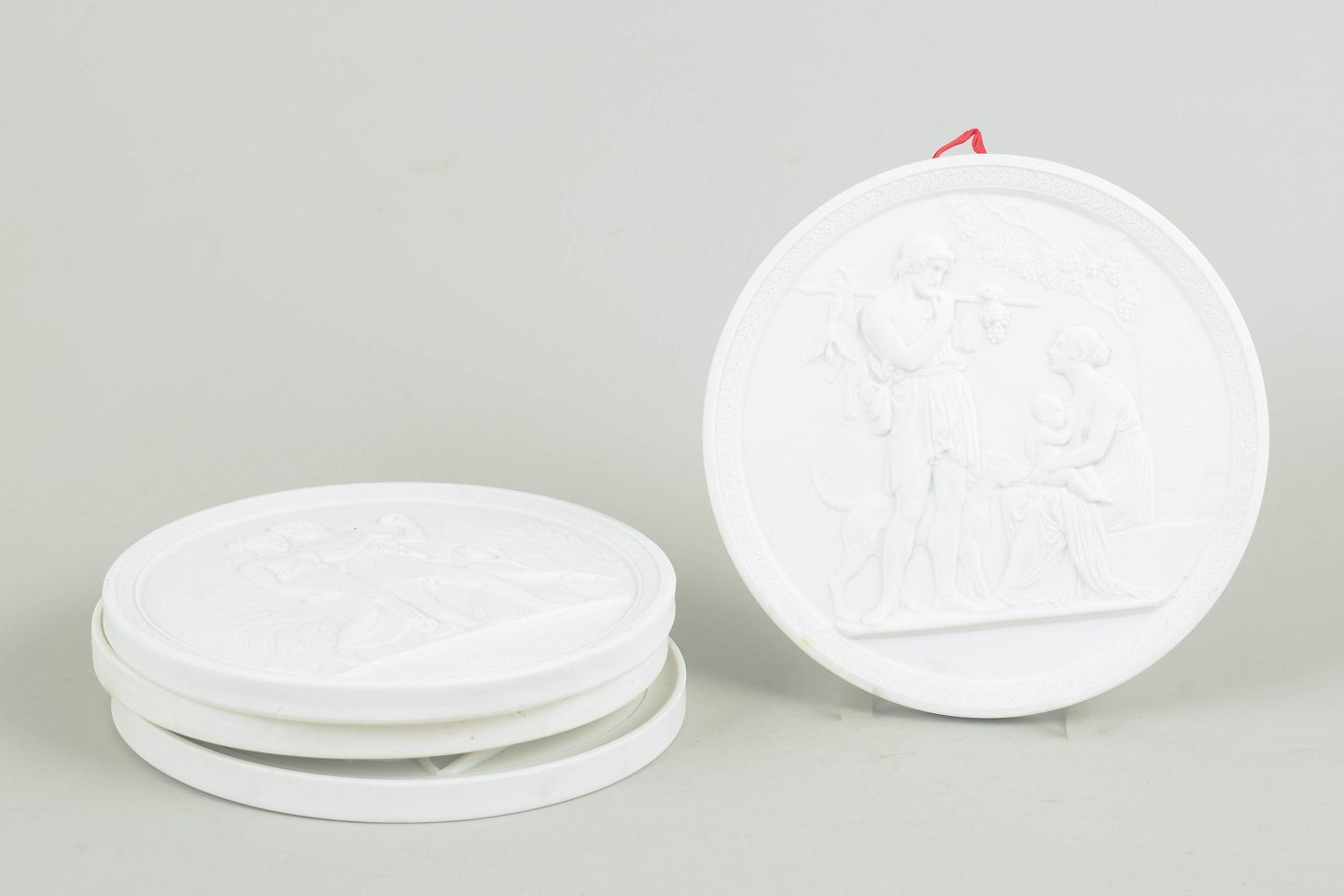Relieffer i hvidt uglaseret porcelæn med klassiske motiver efter Bertel Thorvaldsen, udført i fin biscuit med detaljeret figurdekoration og ophæng på bagsiden. Første og tredje sortering.