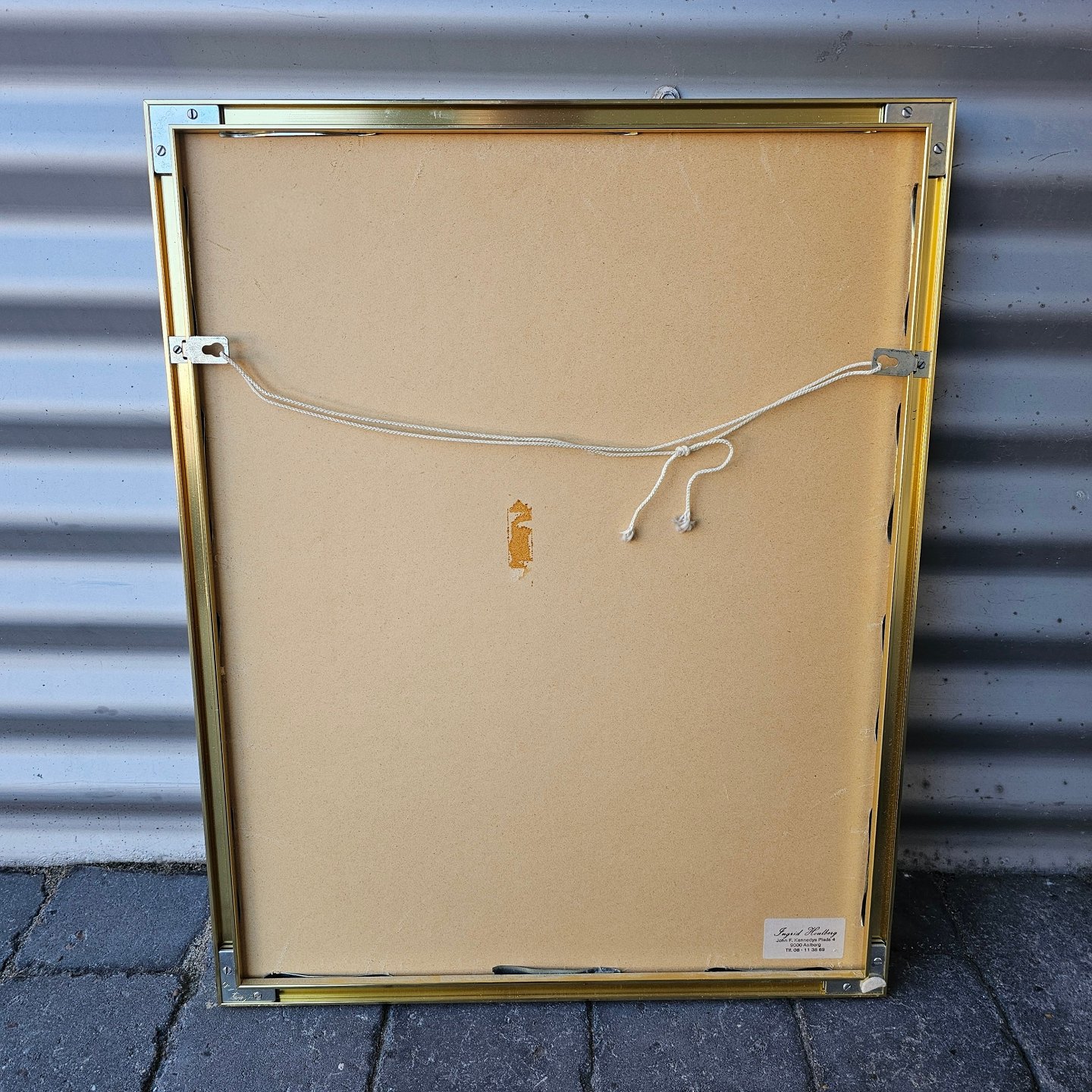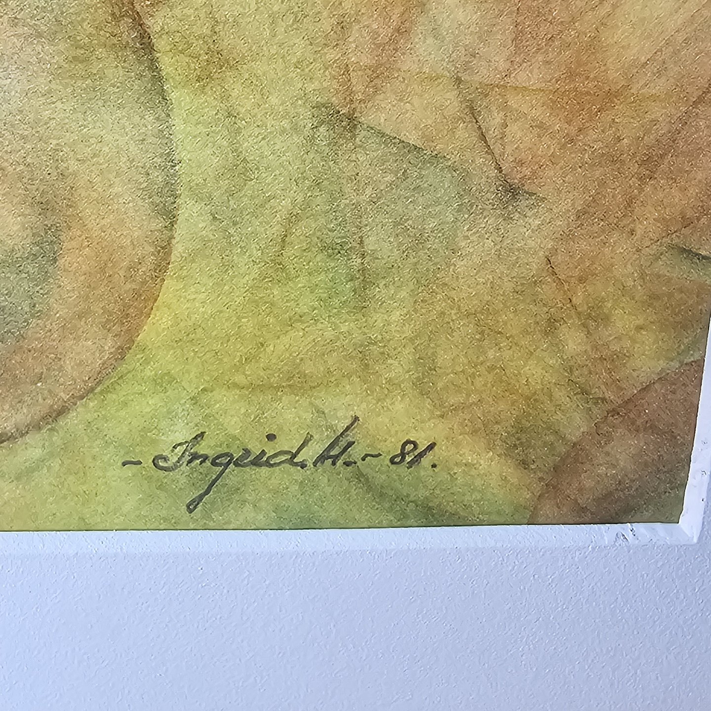 Tryk på papir med motiv af en kvinde i grønne nuancer. Monteret i metalramme, dateret 1981