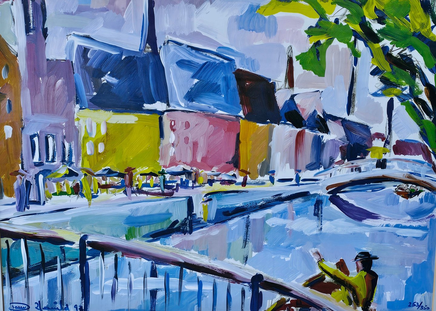 Litografi med motiv af et havnemiljø i guldmalet træramme. Nr. 253/350, dateret 1992