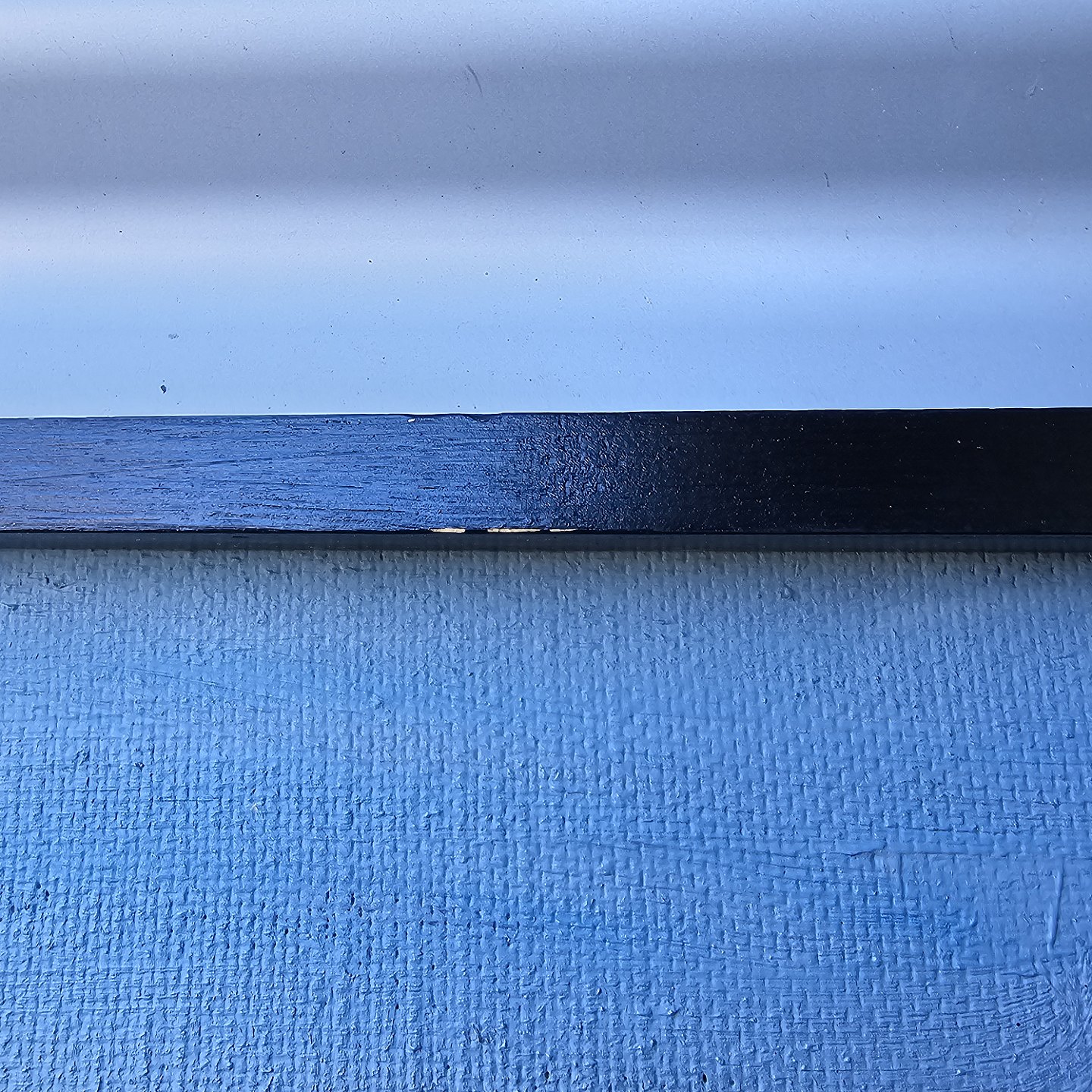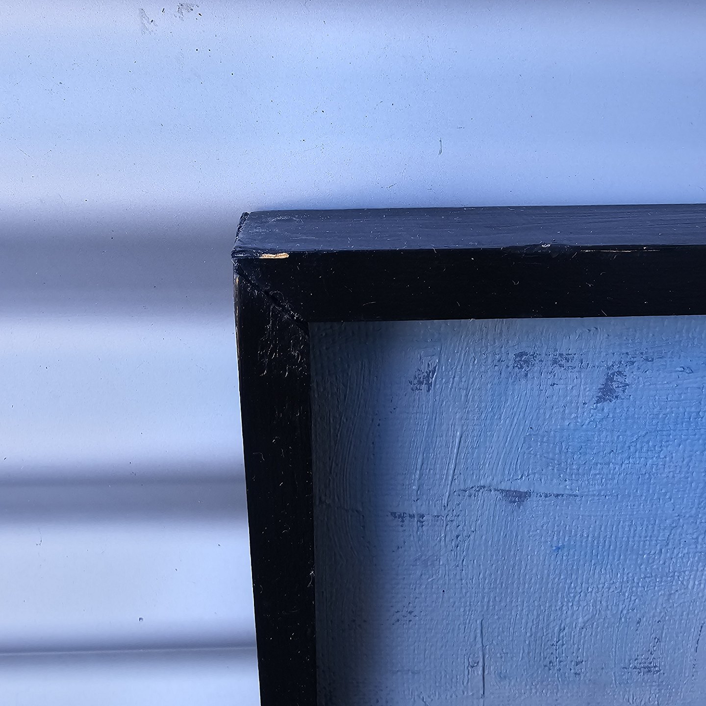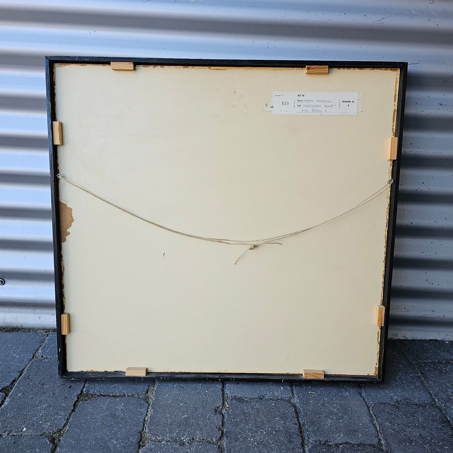 Struktureret oliemaleri på plade med motiv af huse monteret i sortmalet træramme