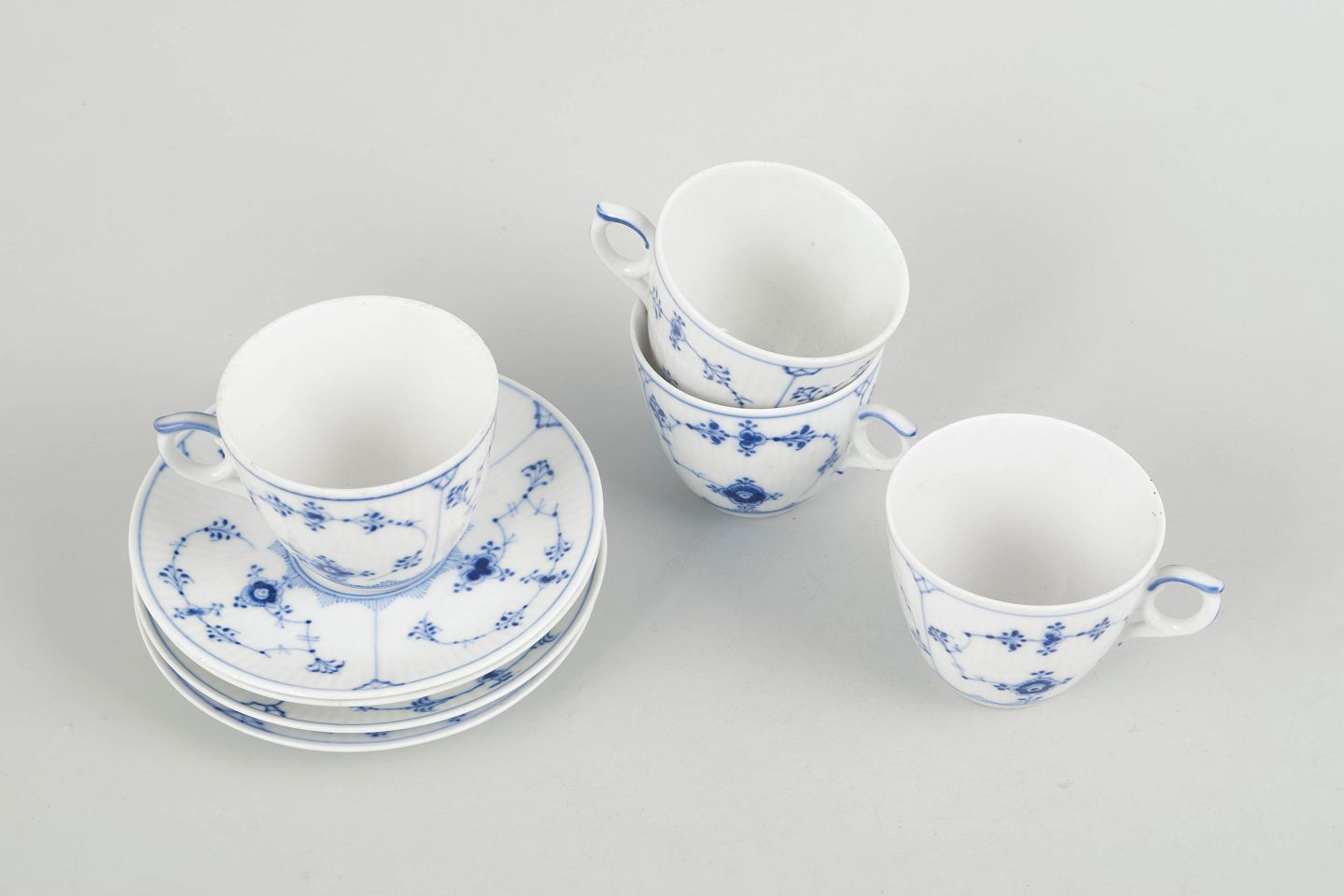 Royal Copenhagen Musselmalet Riflet, sæt af fire kaffekopper med underkopper.