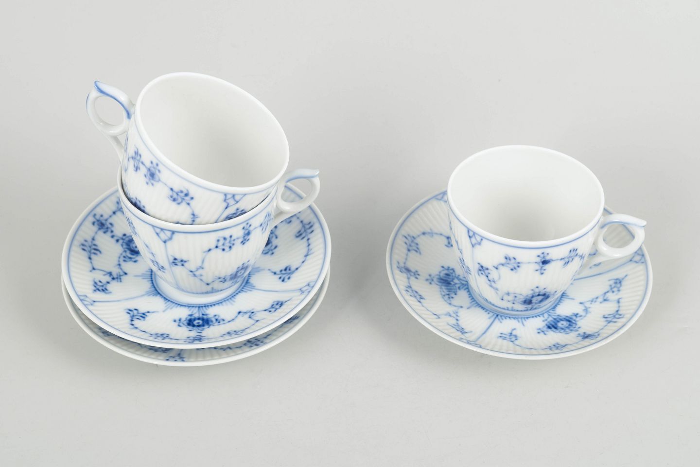 Royal Copenhagen Musselmalet Riflet kaffekopper med underkopper, sæt af tre.
