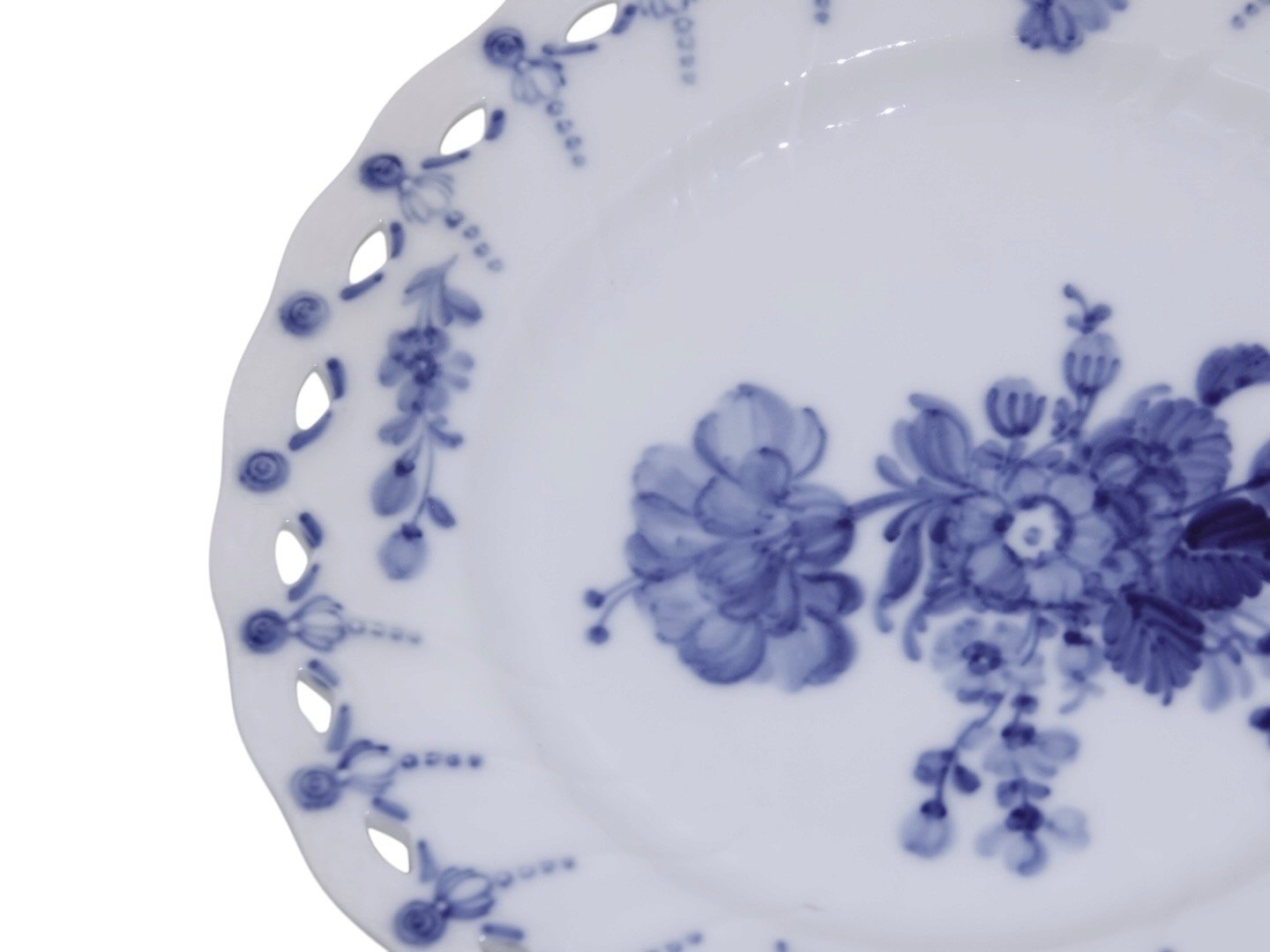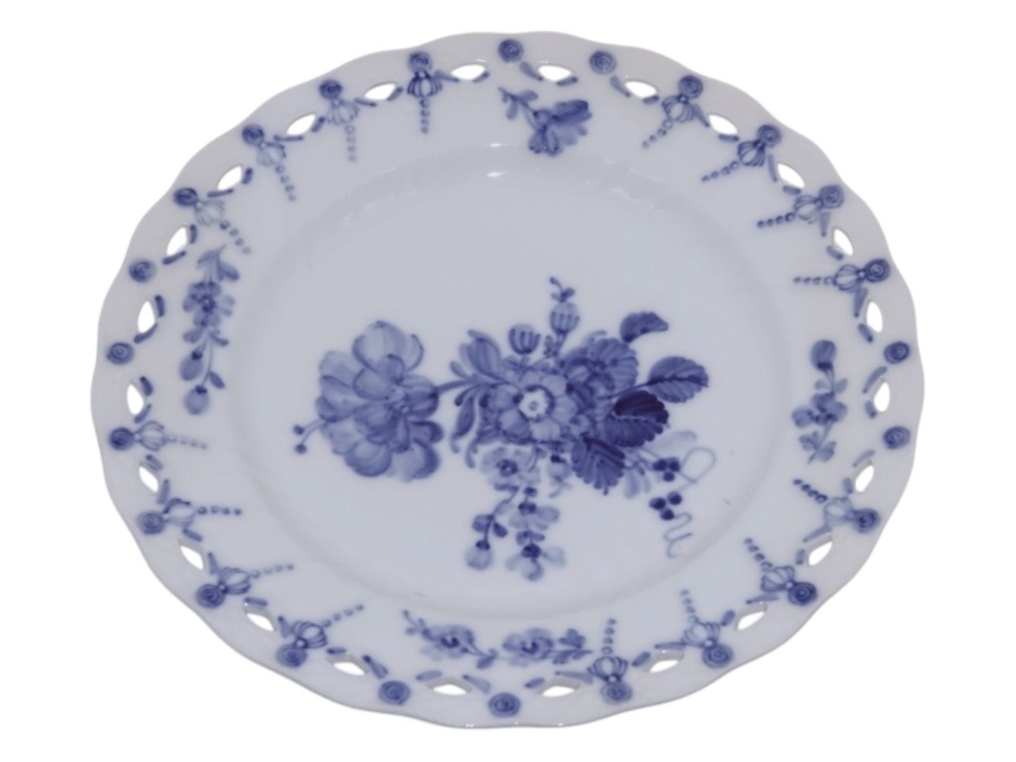 Royal Copenhagen Blå Blomst Svejfet, rund tallerken med helblonde kant. Den kan også bruges som underfad til frugtkurv nummer 10/1575.