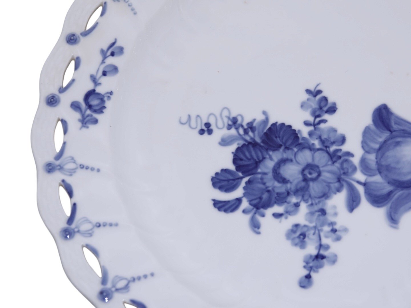 Royal Copenhagen Blå Blomst Svejfet, rundt fad med helblonde kant.