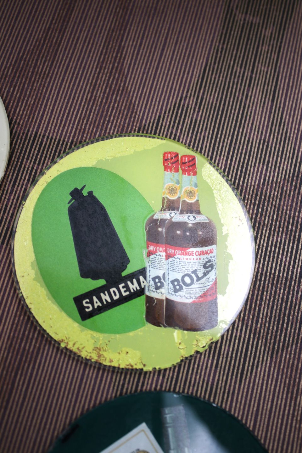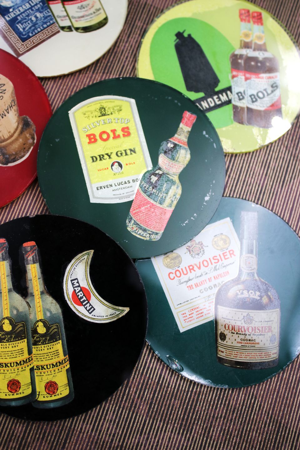 7 gamle drinks glasbakker med motiver af div. spiritus og likør mærker.