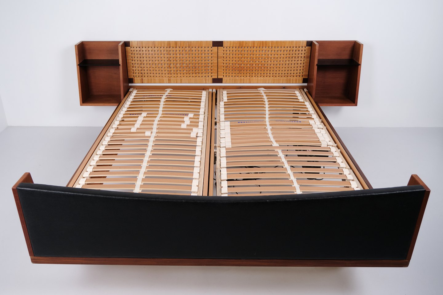 Model GE 701 double bed designed by Hans J. Wegner and manufactured by Getama in the 1950s. Crafted in veneered and solid teak. Headboard and footboard with cane weaving and black faux leather. Headboard with integrated bedside tables featuring black glass shelves and lower shelf. Brass fittings. Hans J. Wegner collaborated with Getama for many years and designed several teak furniture models for home interiors and bedrooms.