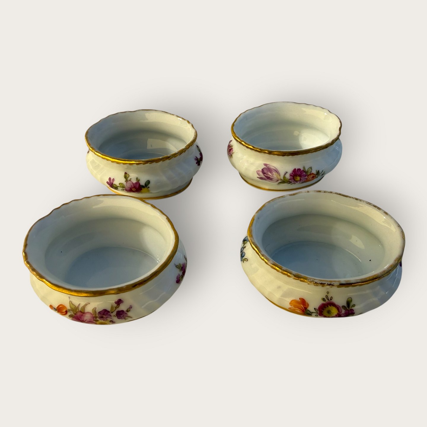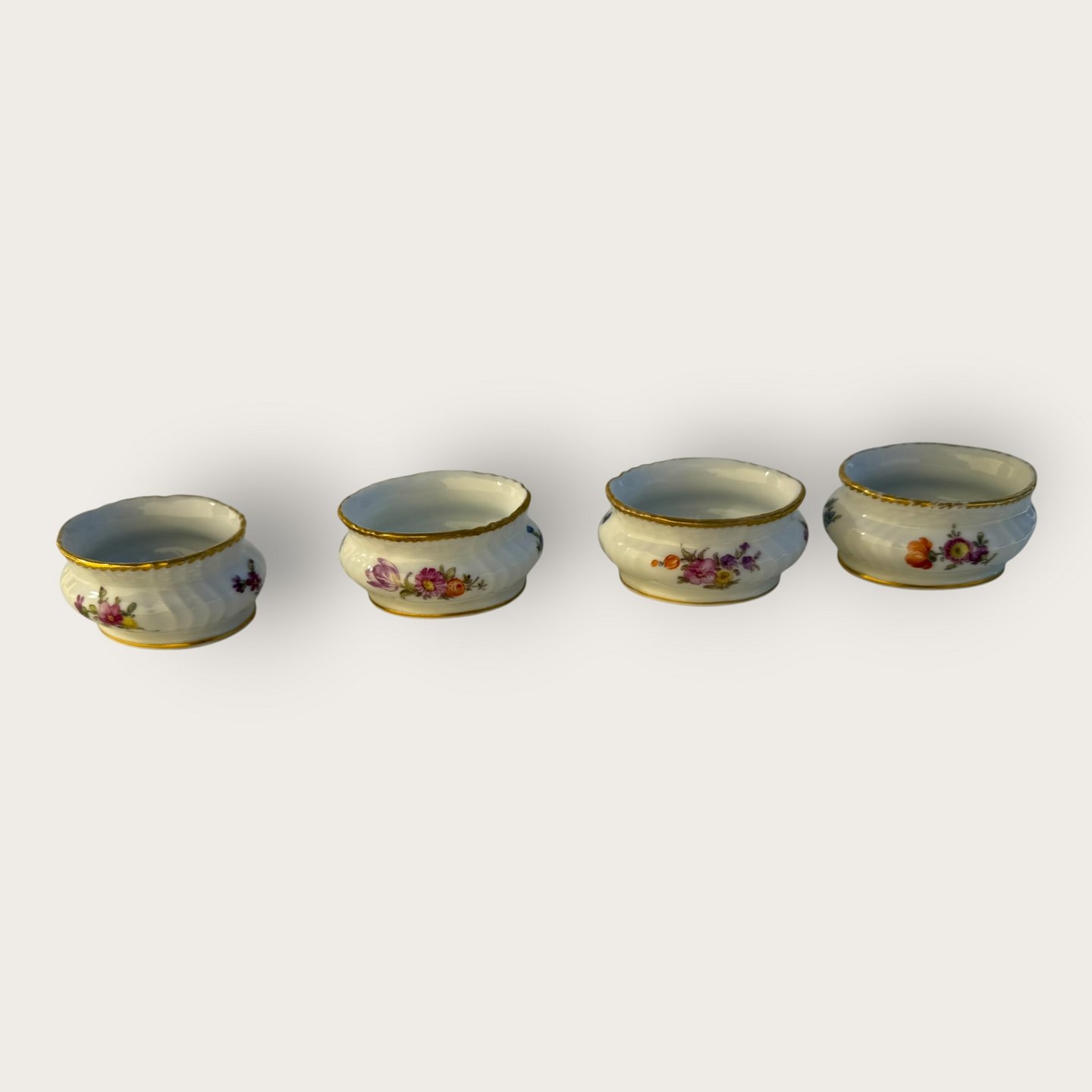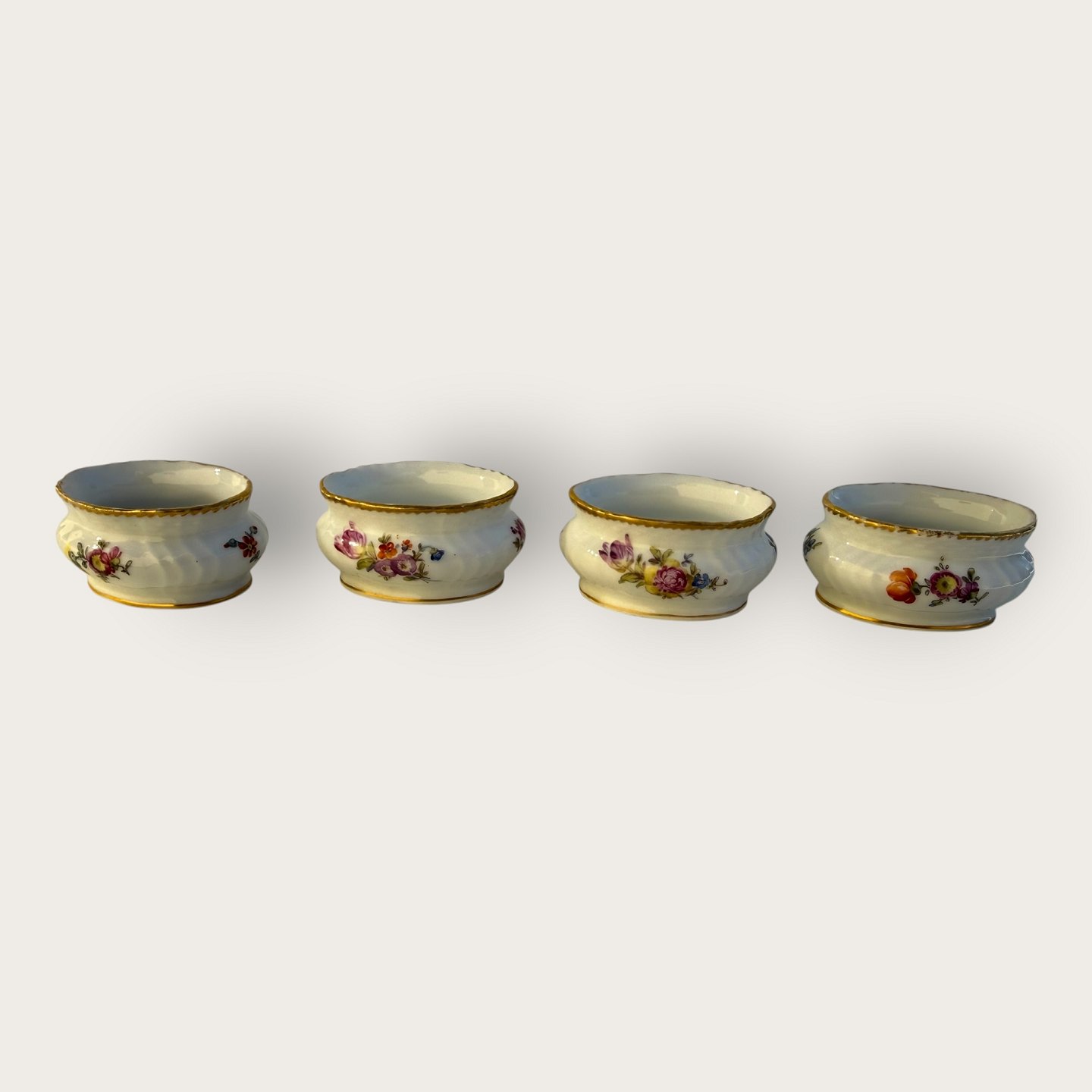 Royal Copenhagen, Fuld saksisk blomst, små saltkar, # 4/1646, Mål: 6x3cm *En med lidt slid på guldkanten ellers pæn stand*