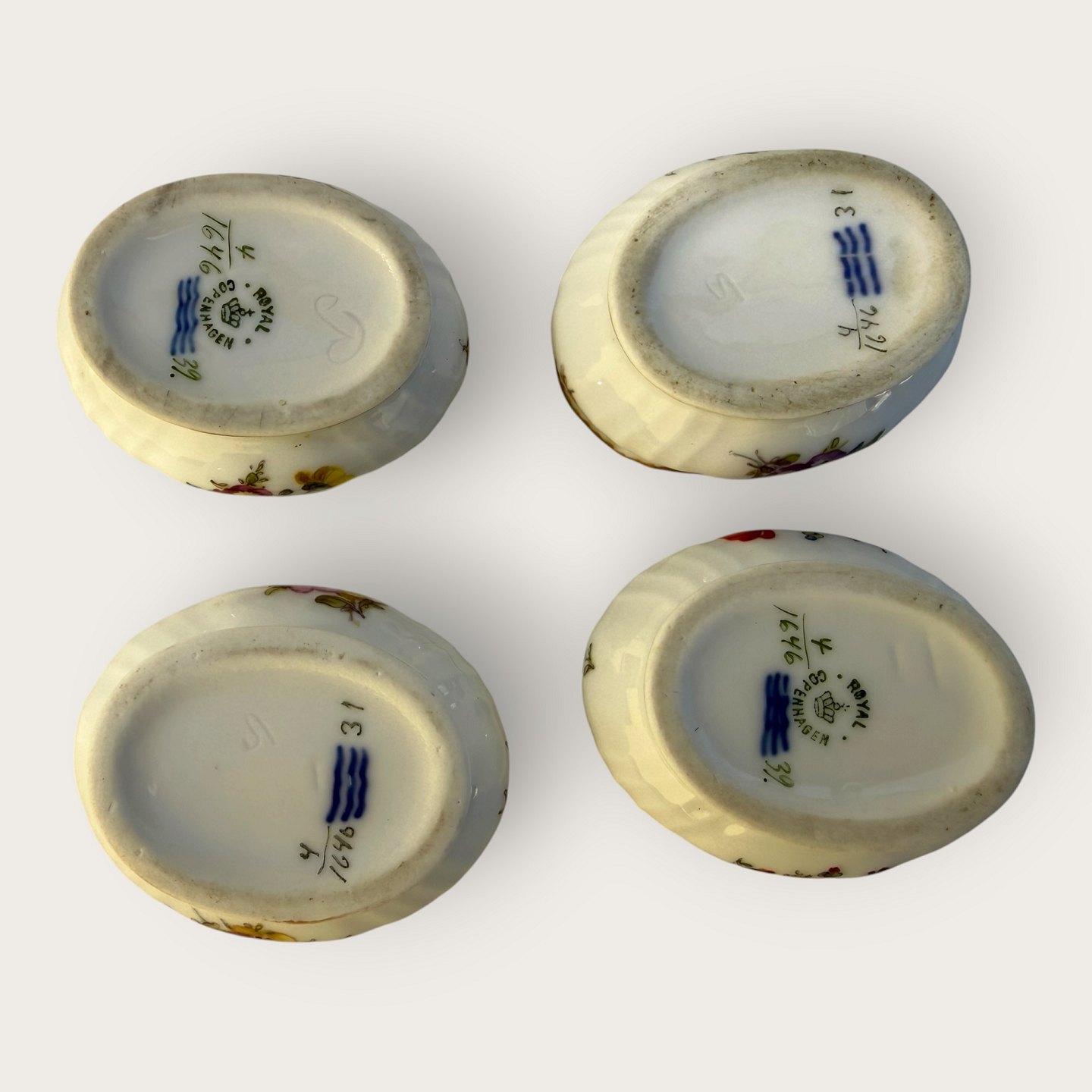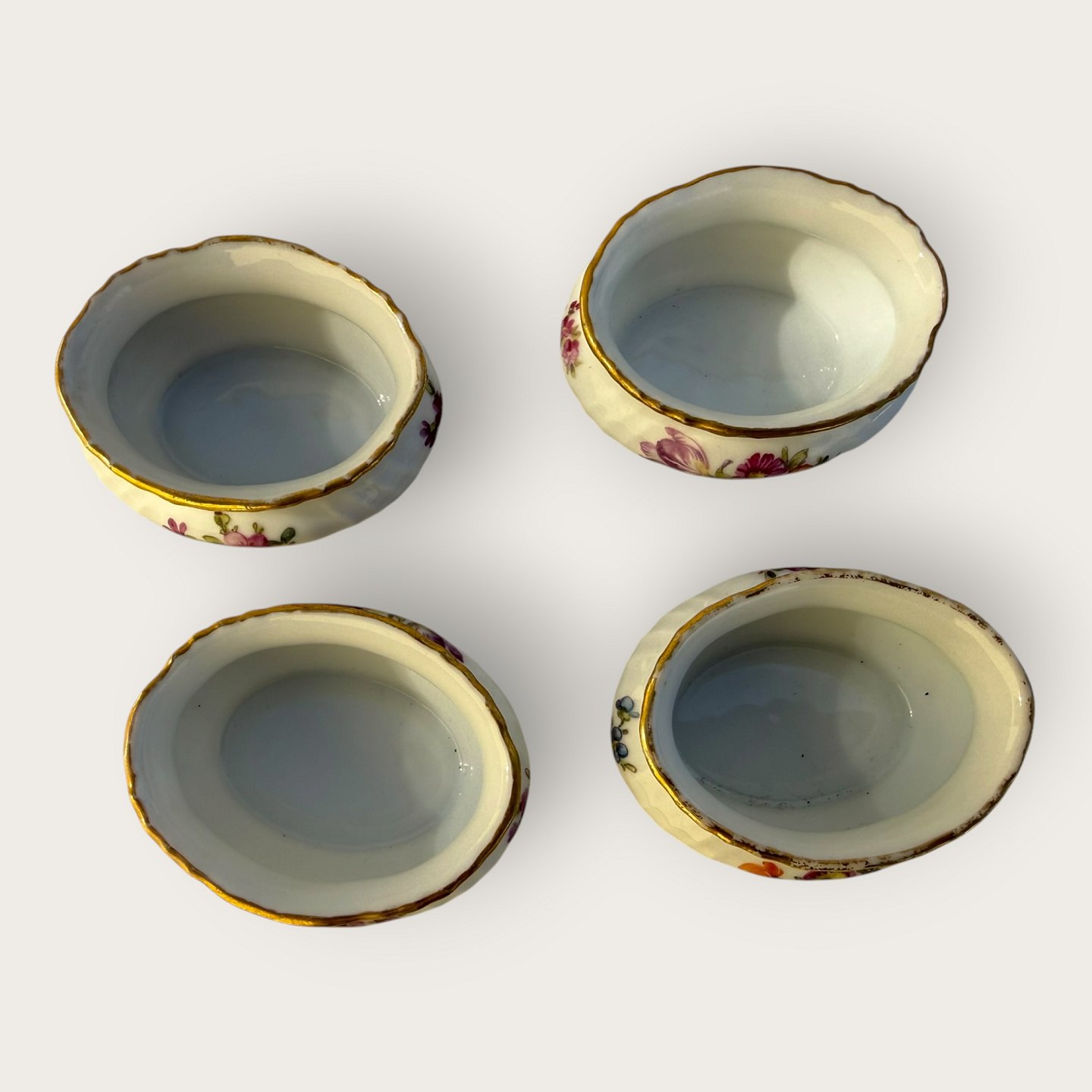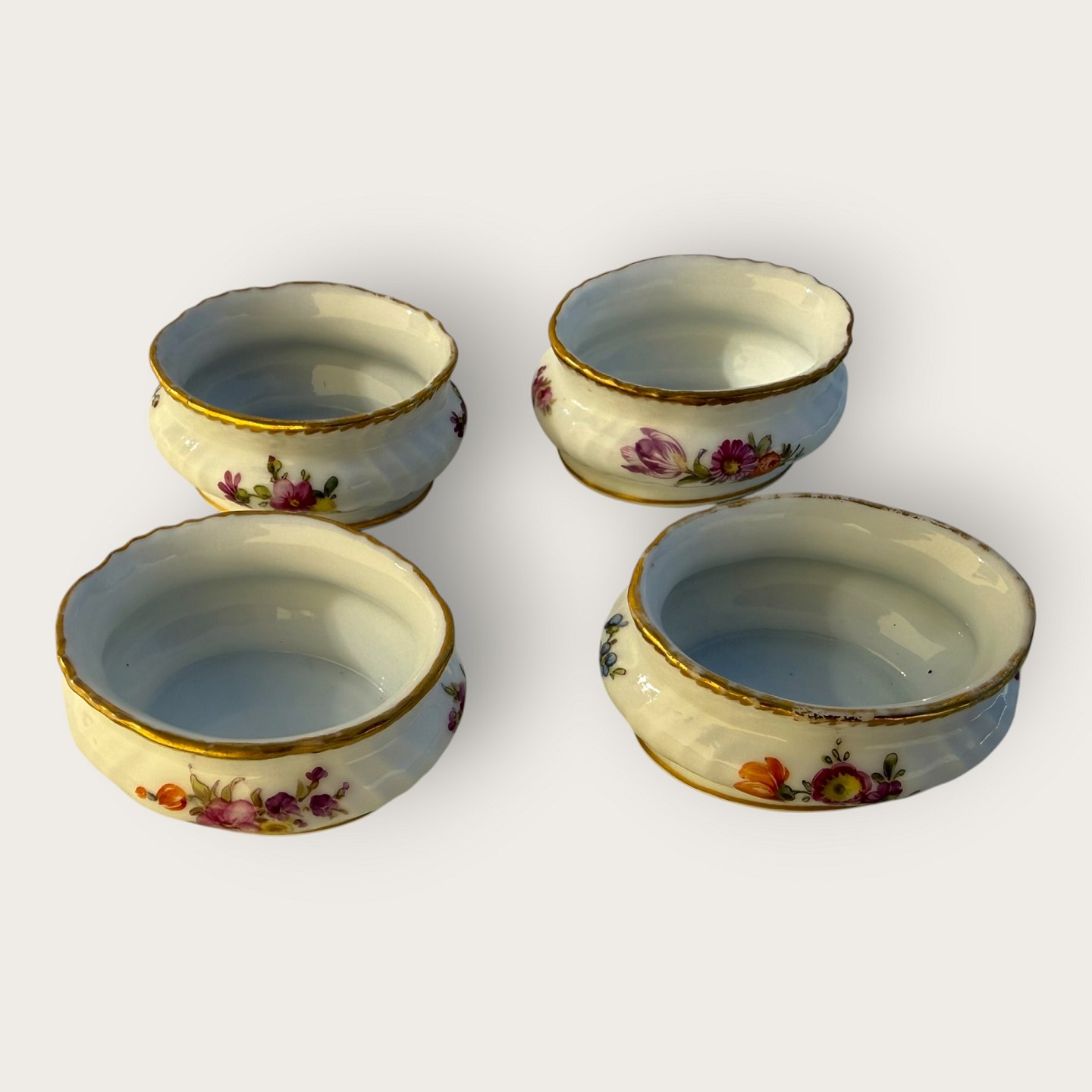 Royal Copenhagen, Fuld saksisk blomst, små saltkar, # 4/1646, Mål: 6x3cm *En med lidt slid på guldkanten ellers pæn stand*