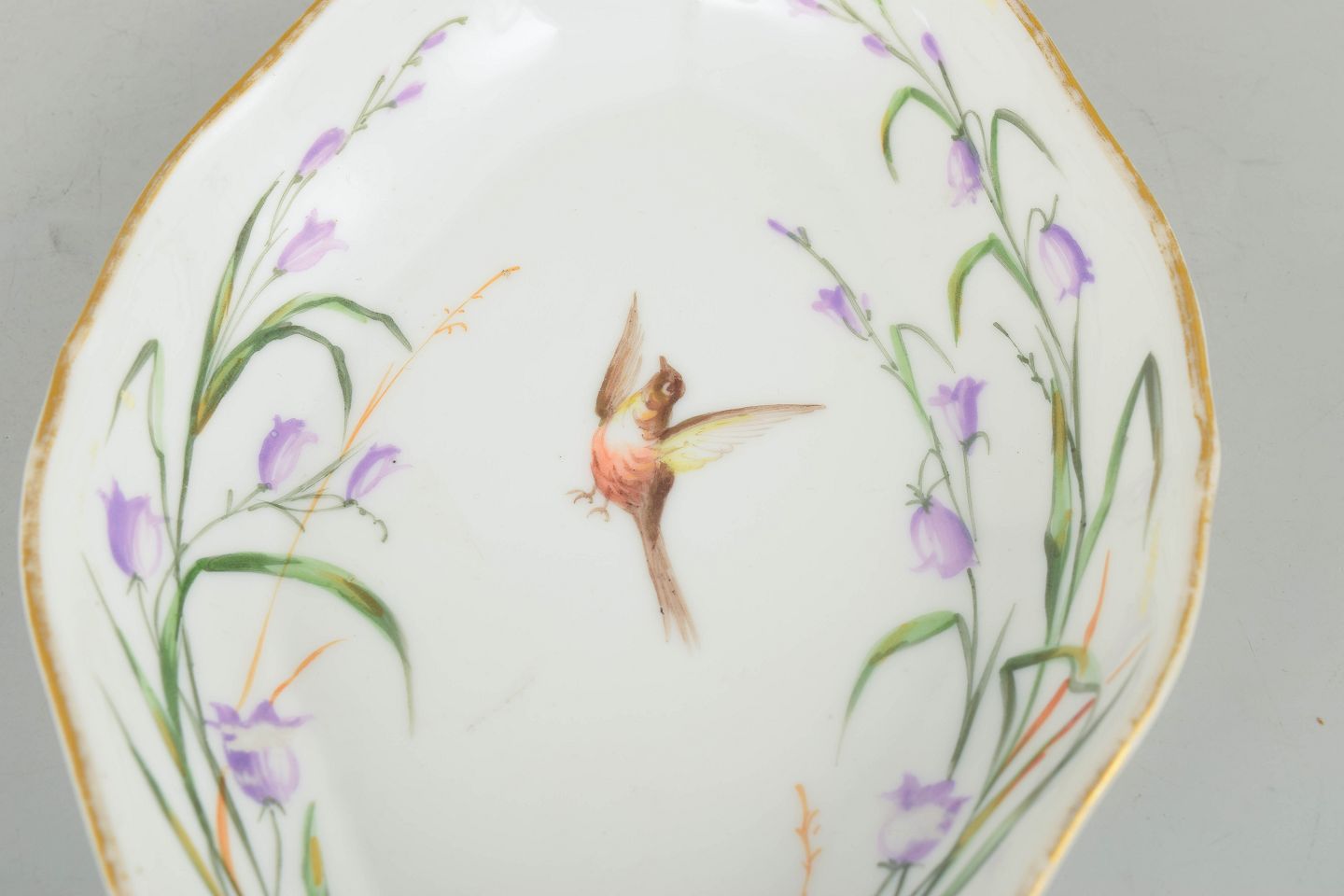 Antikt ovalt fad i håndmalet porcelæn med centralt fuglemotiv og blomsterdekoration i lilla og grønne nuancer, afsluttet med guldkant langs randen.