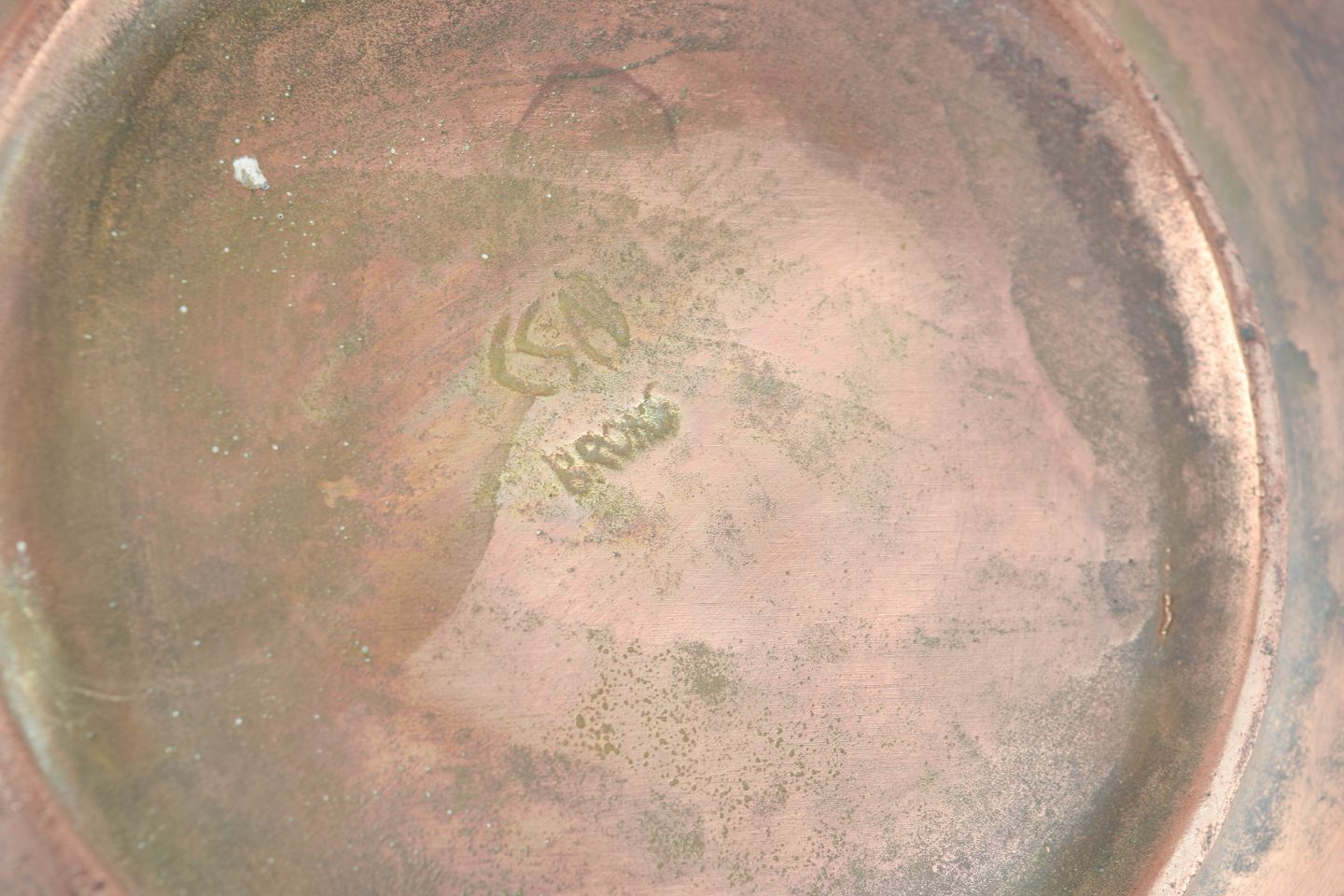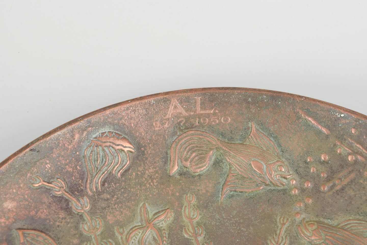 Rare circular bronze dish with relief decoration of stylised fish, aquatic plants and organic forms, executed with a characteristic patinated surface in warm copper and green tones. With engraved initials from a previous owner.