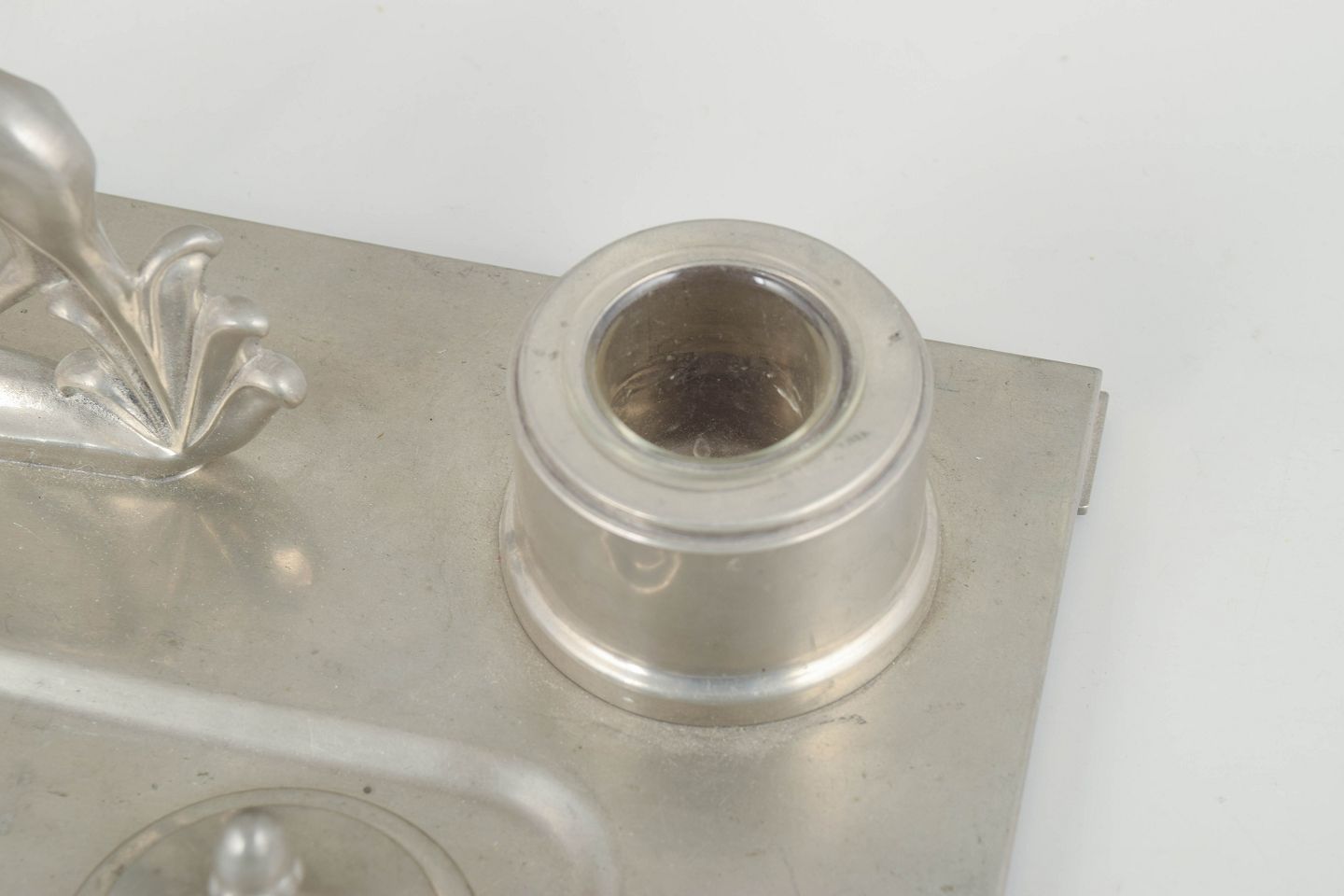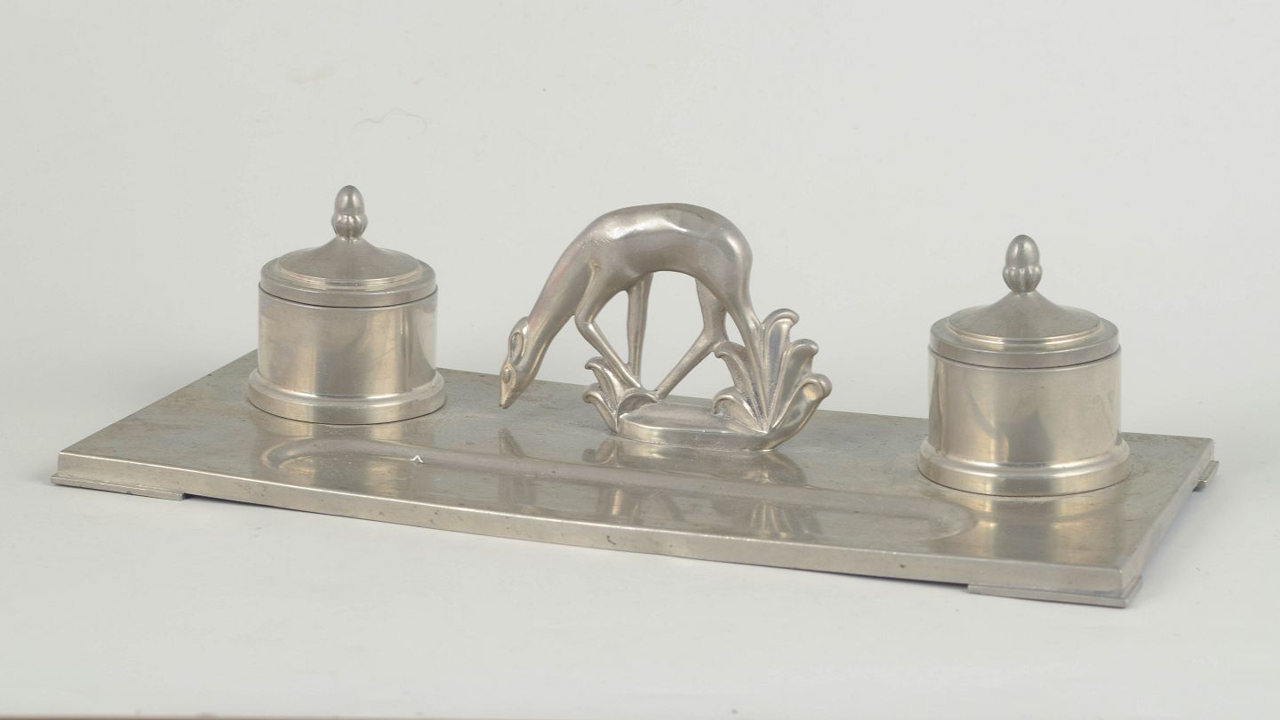 Rectangular pewter ink well with two containers and a sculptural deer figure at the centre. One glass insert is missing. Marked on the base.