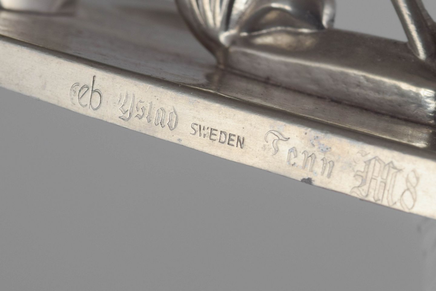 Carl Einar Borgström (1879–1969) was a Swedish sculptor and designer known for his work in pewter for Ystad Tenn. He created a range of distinctive objects featuring naturalistic and decorative motifs, often inspired by animals and nature. Ystad Tenn, founded in 1920, became renowned for high-quality pewter and craftsmanship during the interwar period.