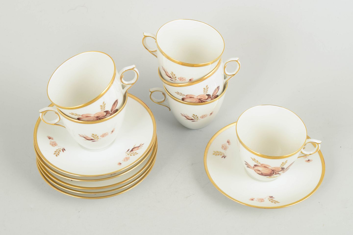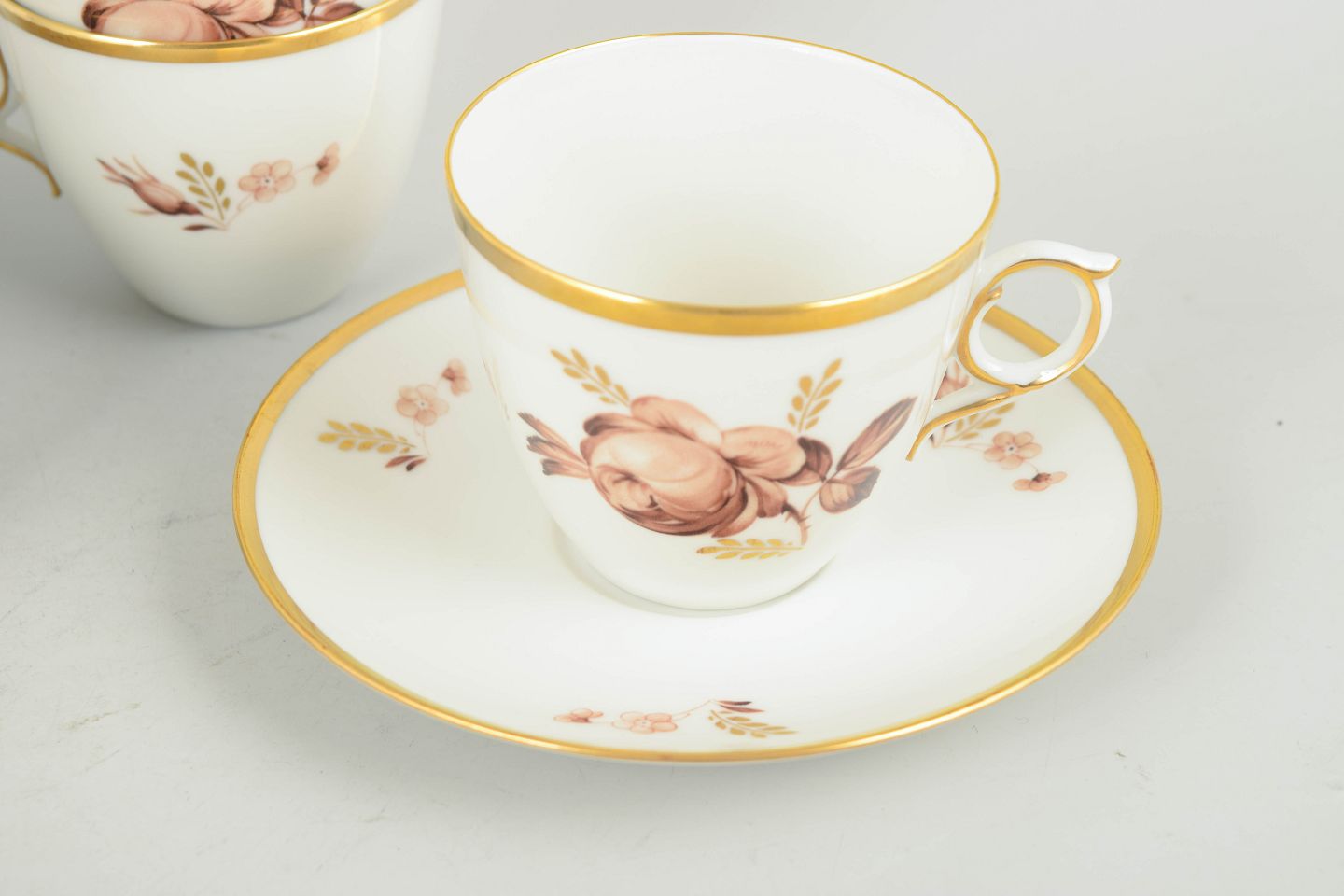 Kaffekopper med tilhørende underkopper i hvidt porcelæn med brun blomsterdekoration og guldkant, model 688/9069, fra 1970’erne, første sortering.