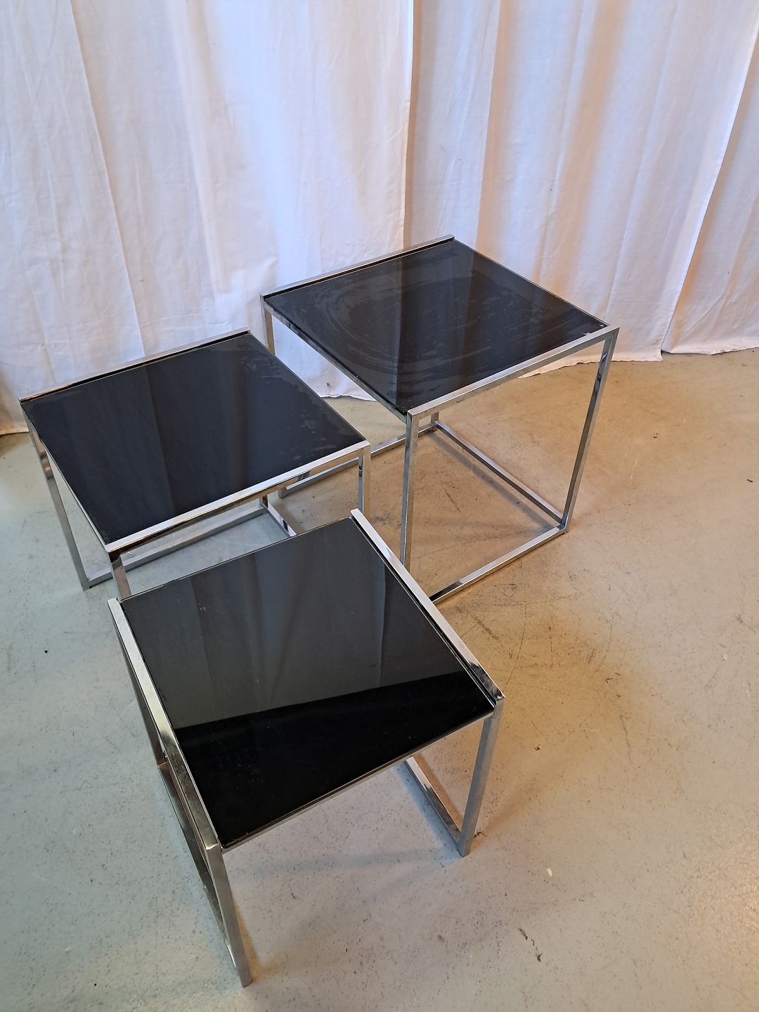 3 Indskudsborde i metal med glasplader, fra 1990erne.
