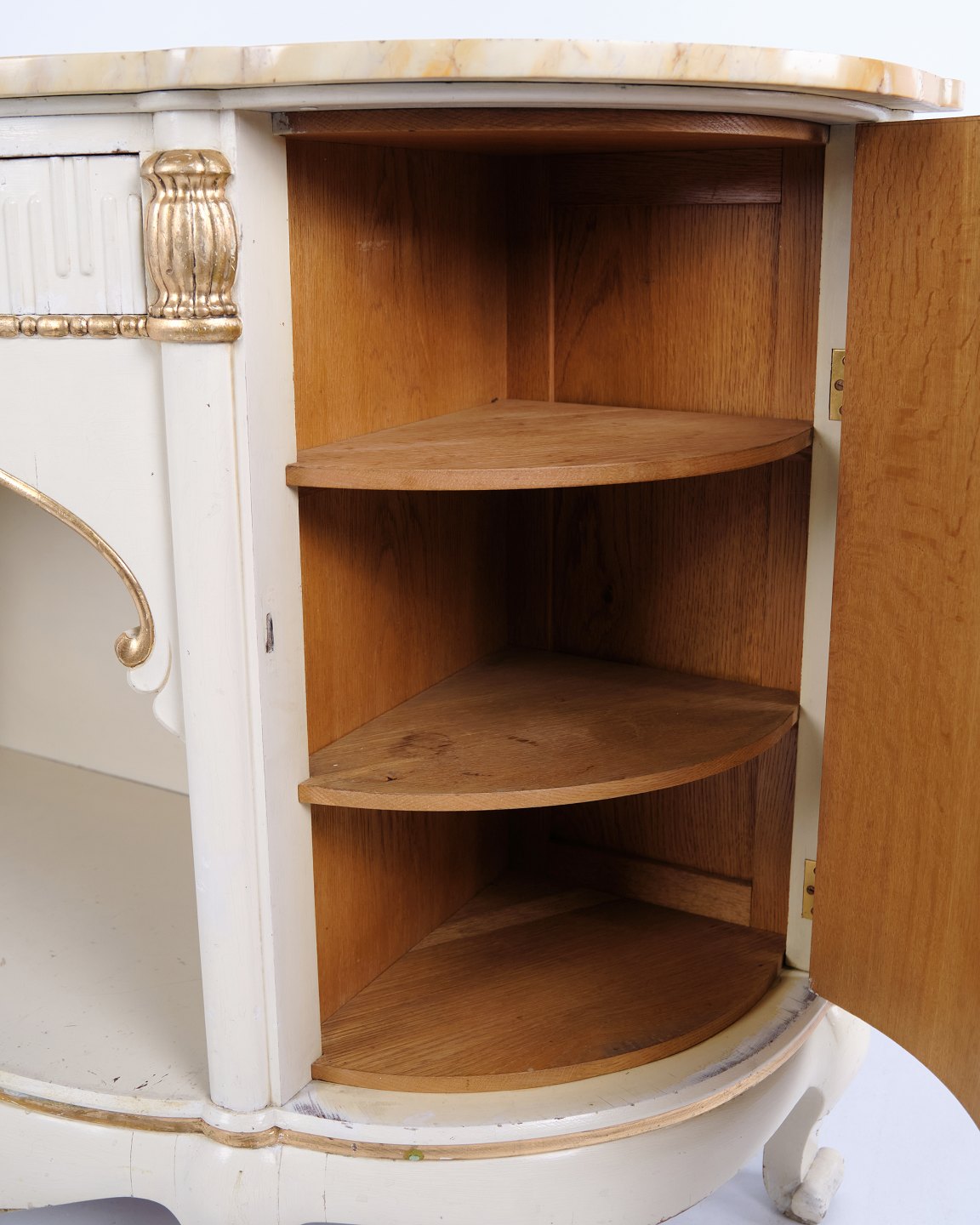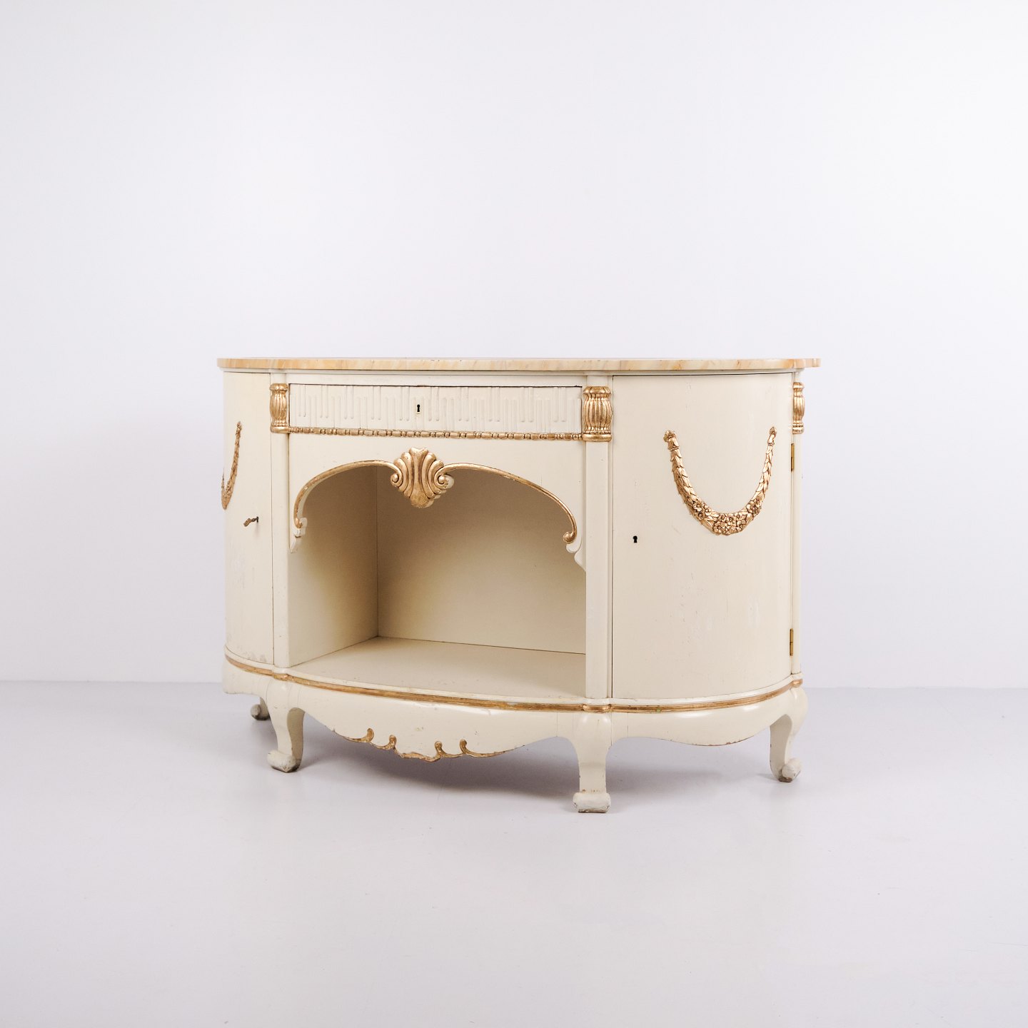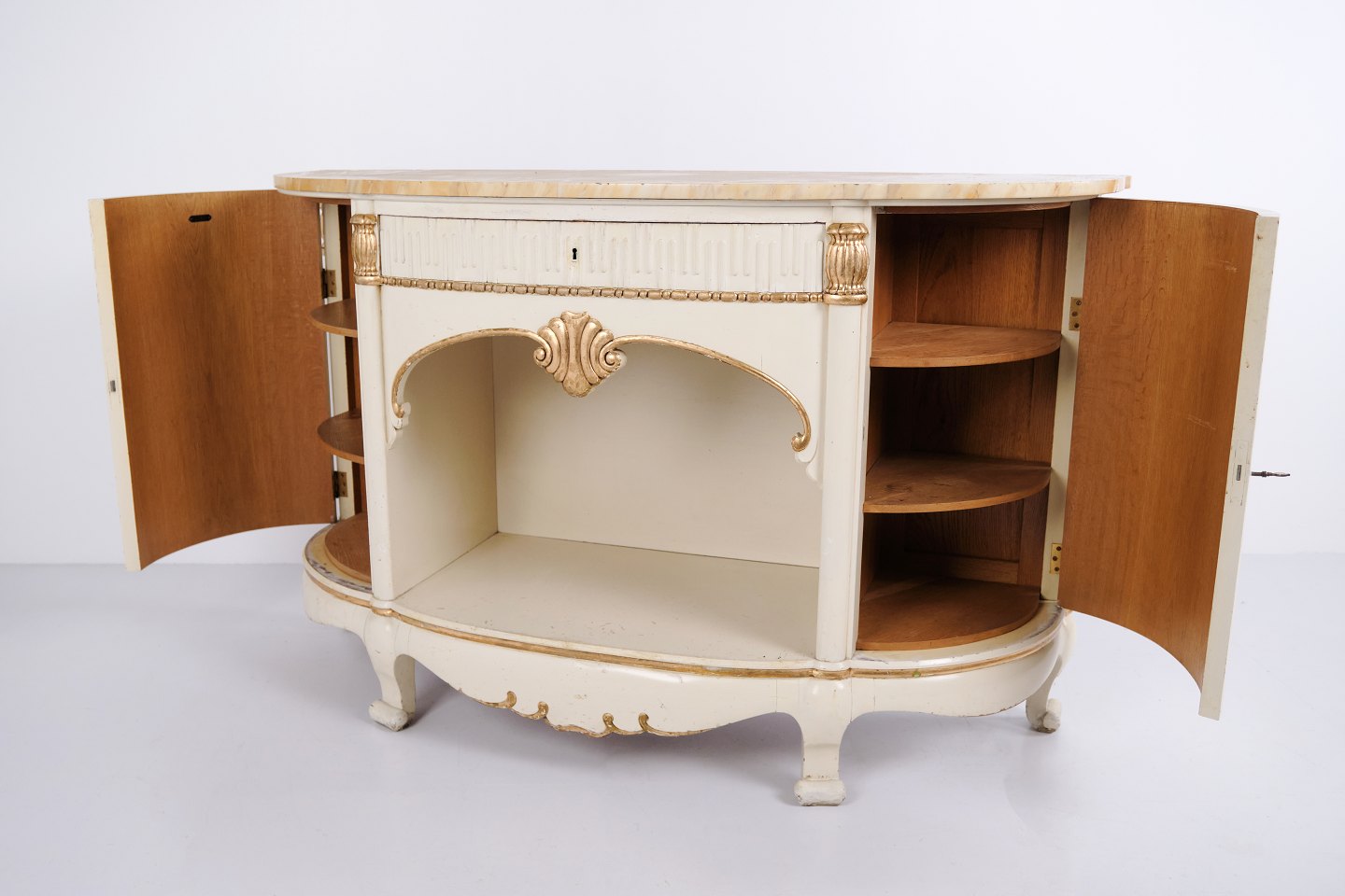 Buet skænk fremstillet af P. Svensen, N. Frihavnegade 15, København. Møblet er udført i malet træ med profilerede detaljer, forgyldte dekorationer og original marmorplade. Fronten har åben midterniche, lille skuffe samt to buede skabe med indvendige hylder. Klassisk empireinspireret form med buede sider, svungne ben og dekorative beslag. Velegnet som entrémøbel, konsol eller opbevaringsskænk.