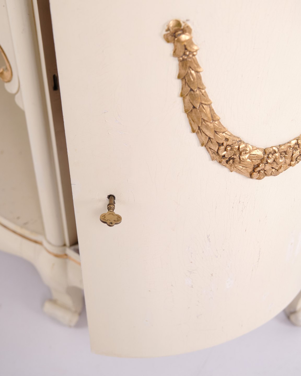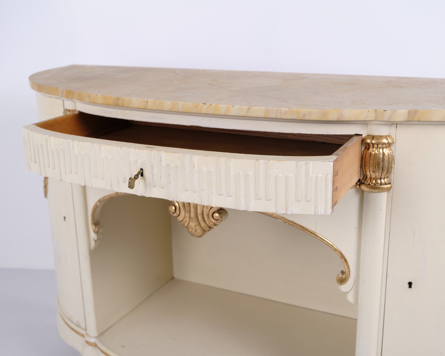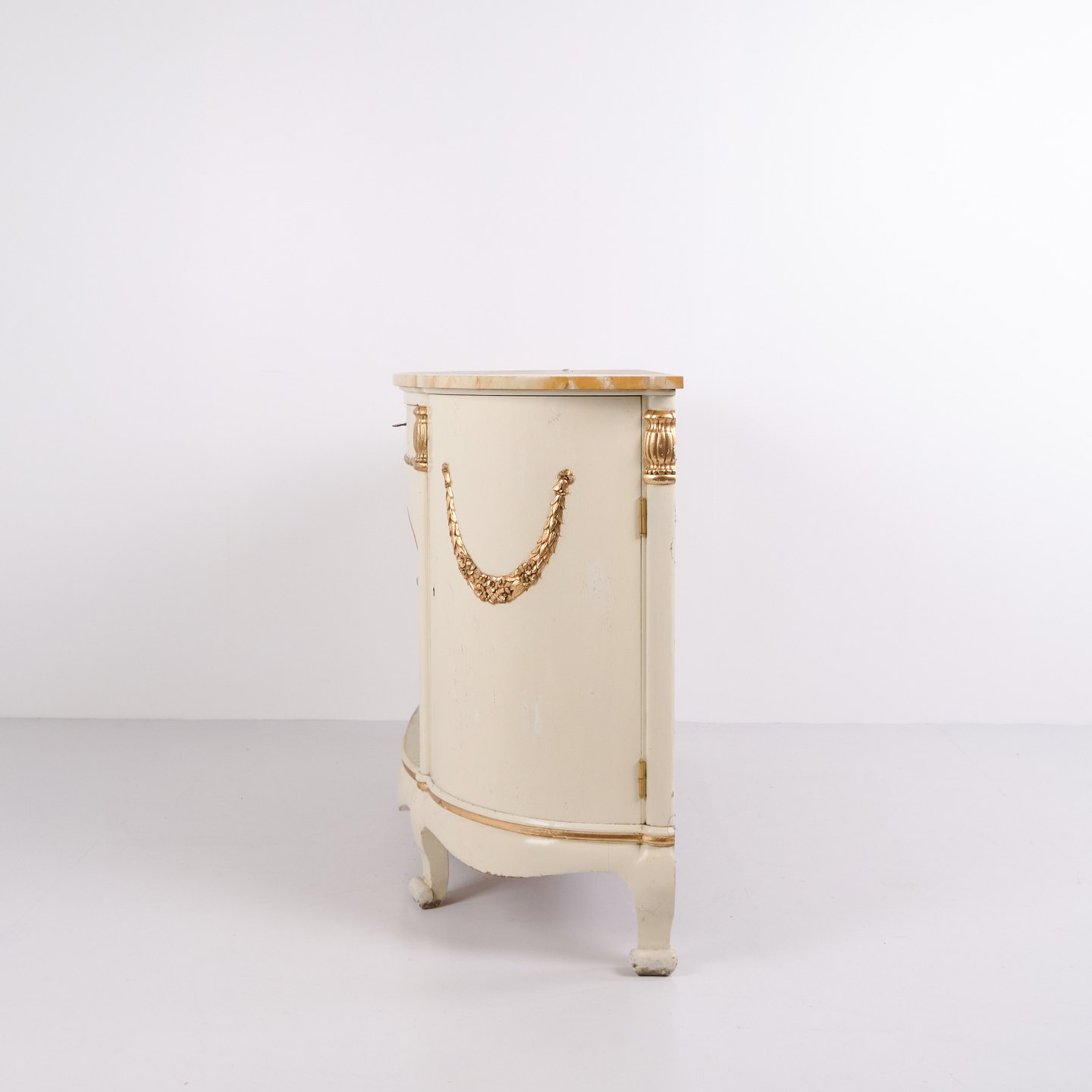 Buet skænk fremstillet af P. Svensen, N. Frihavnegade 15, København. Møblet er udført i malet træ med profilerede detaljer, forgyldte dekorationer og original marmorplade. Fronten har åben midterniche, lille skuffe samt to buede skabe med indvendige hylder. Klassisk empireinspireret form med buede sider, svungne ben og dekorative beslag. Velegnet som entrémøbel, konsol eller opbevaringsskænk.