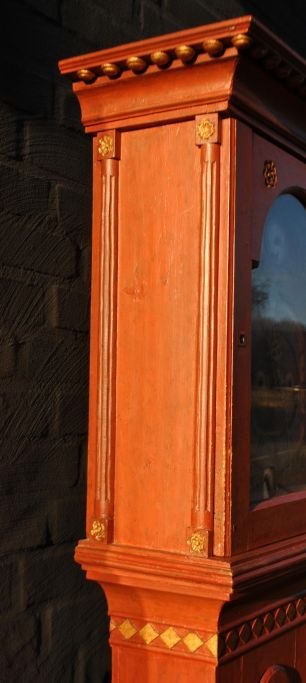 Antikt dansk standur i malet kasse, 1807. Udført af urmager Søren Marcussen (ca. 1775 - ?), Sønderlund, Måbjerg. Salling. Rødlig malet masse med forguldninger og udskæringer. Urværk med tinskive. H.: 200 cm. B.: 43 cm. D.: 26 cm.