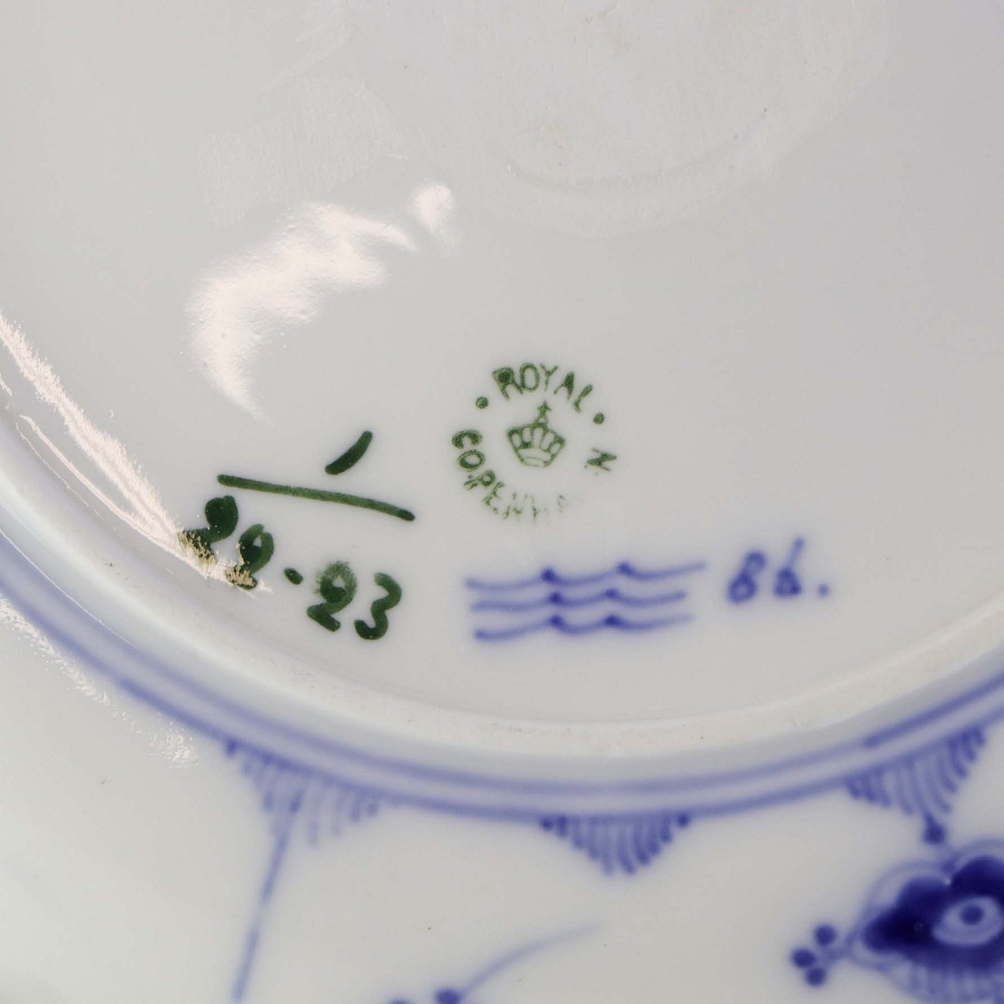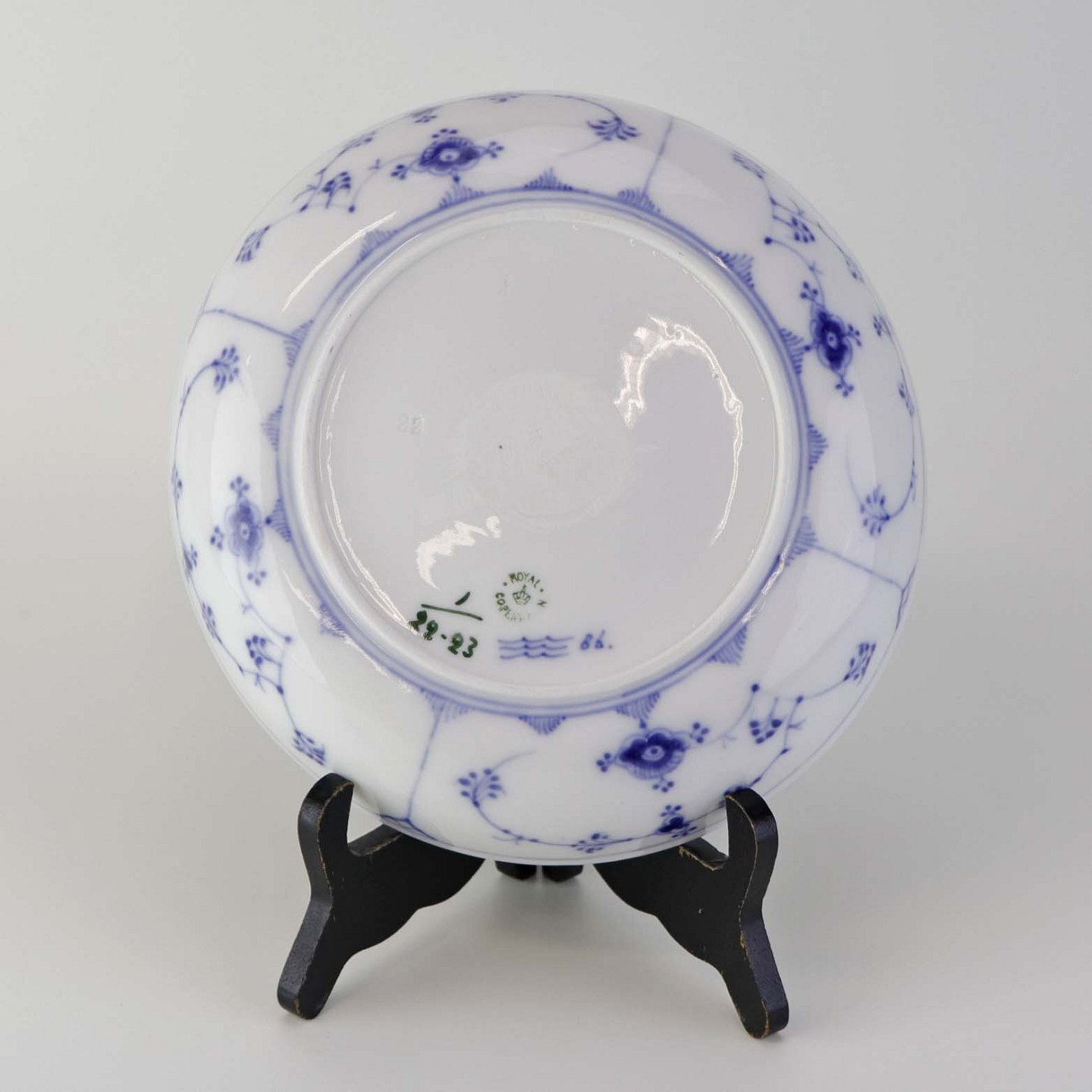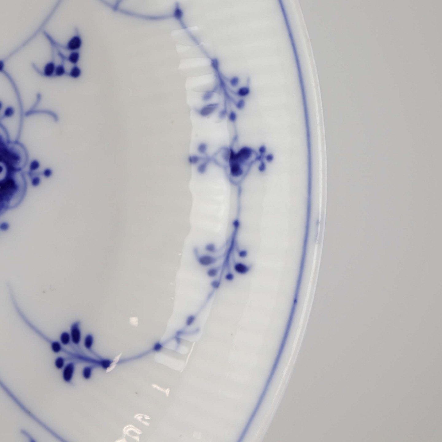 Musselmalet er af kongeligt hvidt porcelæn, dekoreret med rifler og mønster af blå ranker og blomster.