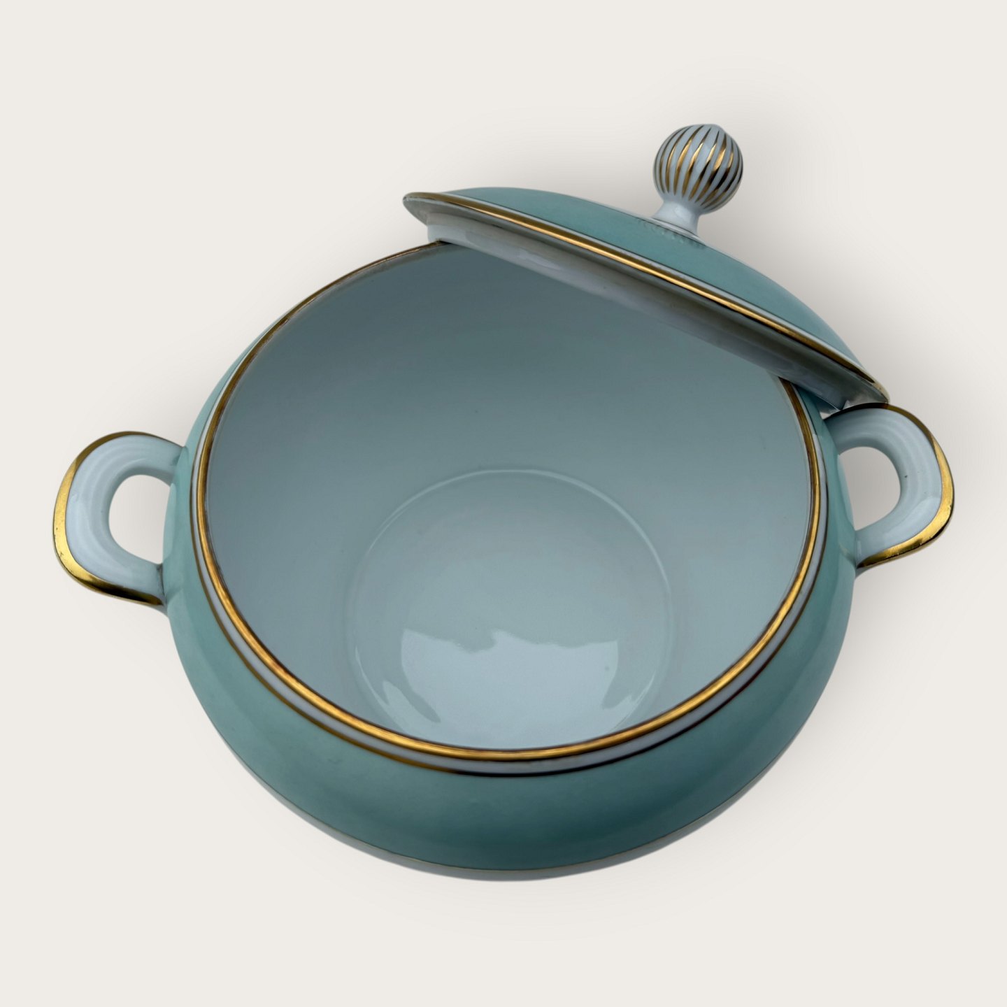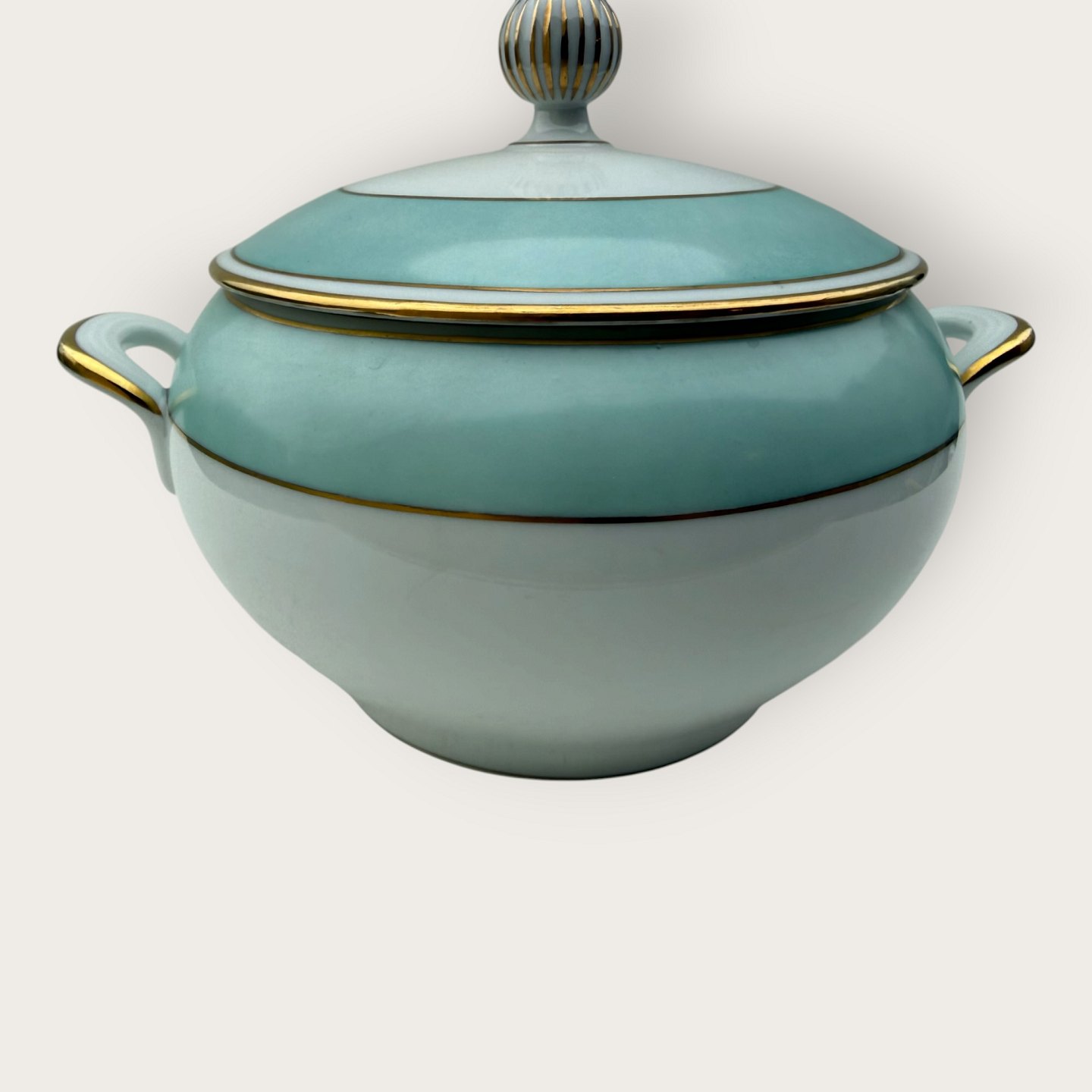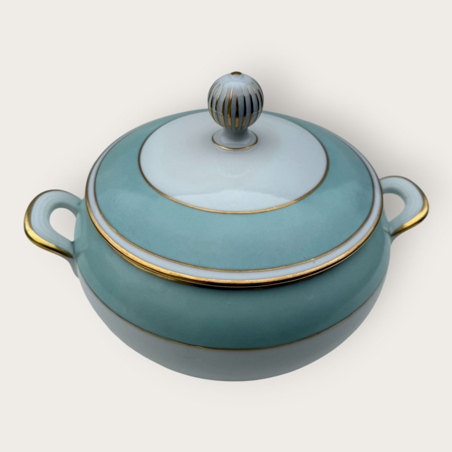 Bing & Grøndahl, Form 643 med bred turkis dekoration og guldkant, Terrin, #5, højde 17cm, bredde 26cm, 2. sortering, *pæn stand*