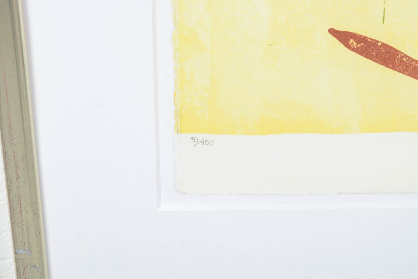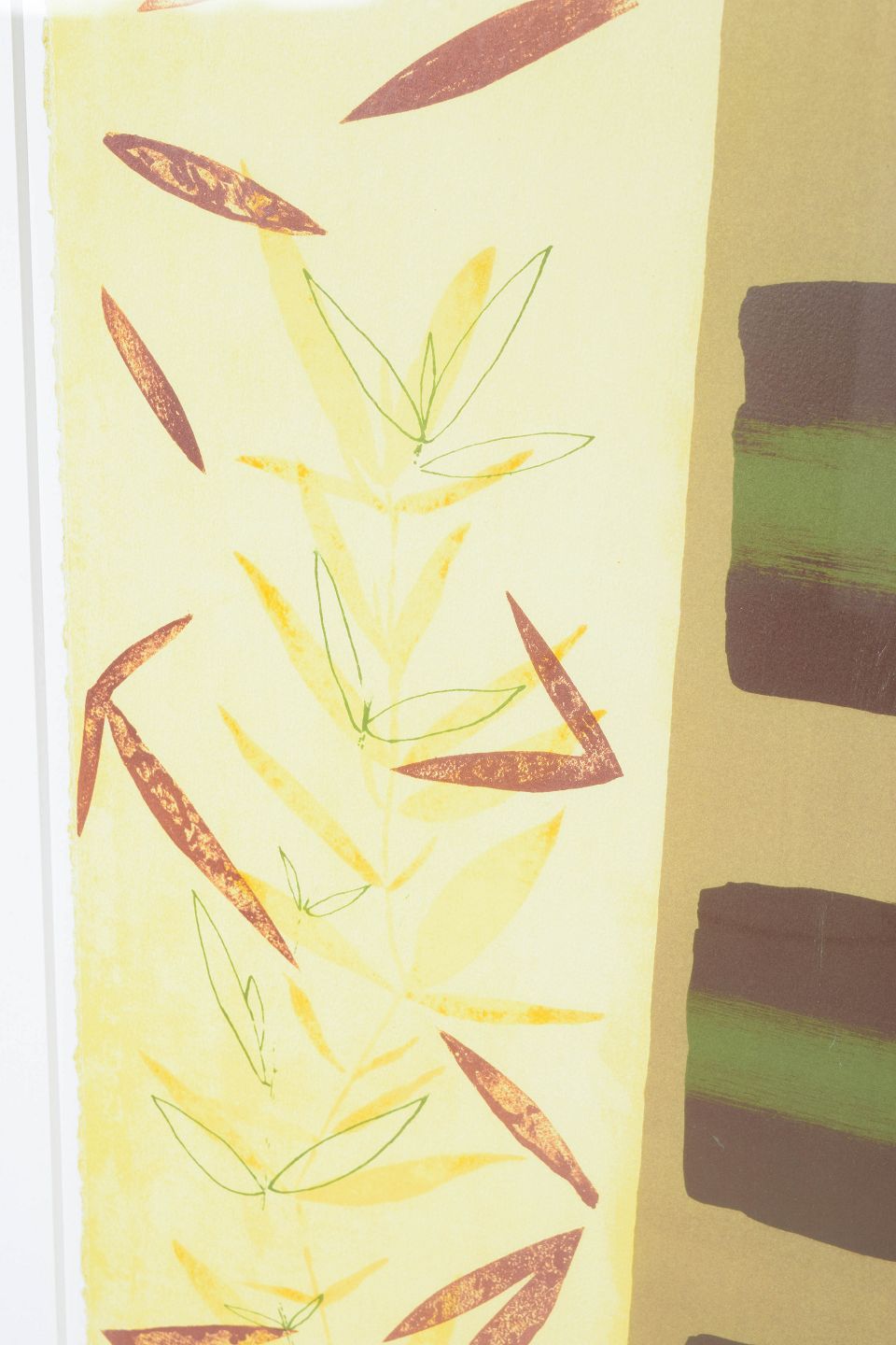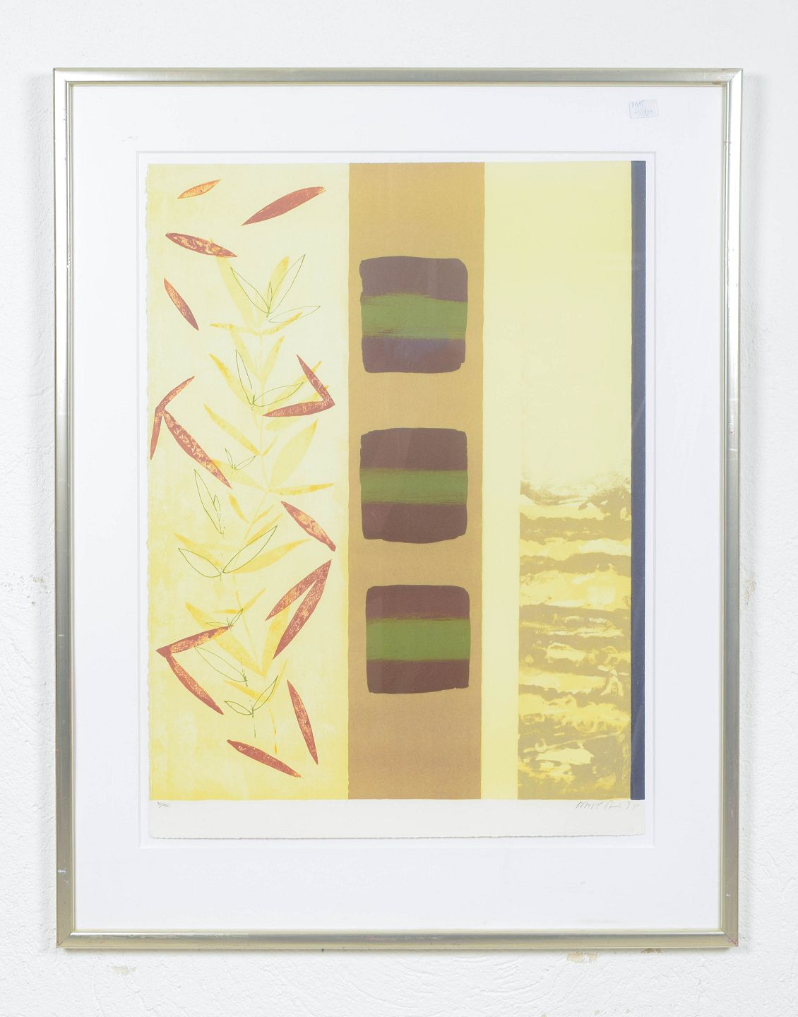 Abstrakt og grafisk komposition med organiske former og geometriske felter i afdæmpede farver, udført som farvelitografi, signeret og nummereret 30/150, dateret 1995.