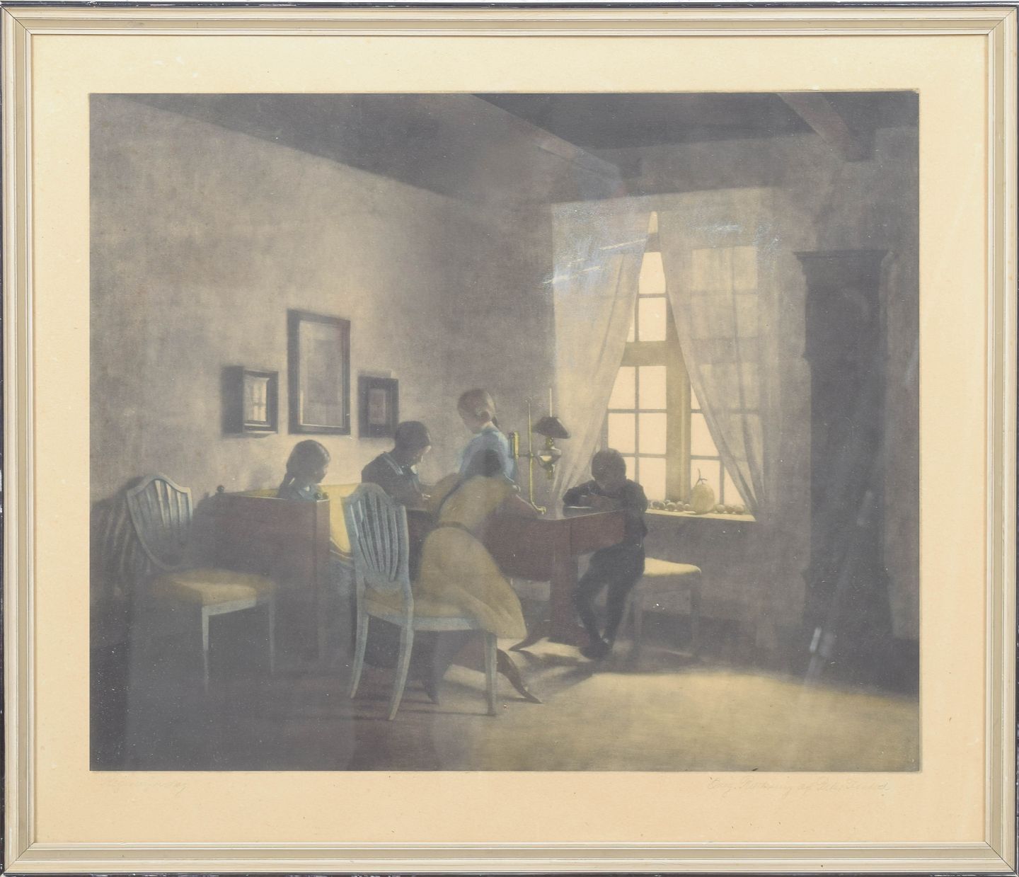 Stille interiørscene med figurer omkring et bord i dæmpet lys, udført som mezzotinte i Ilsteds karakteristiske tonale og atmosfæriske stil. Signeret i blyant.