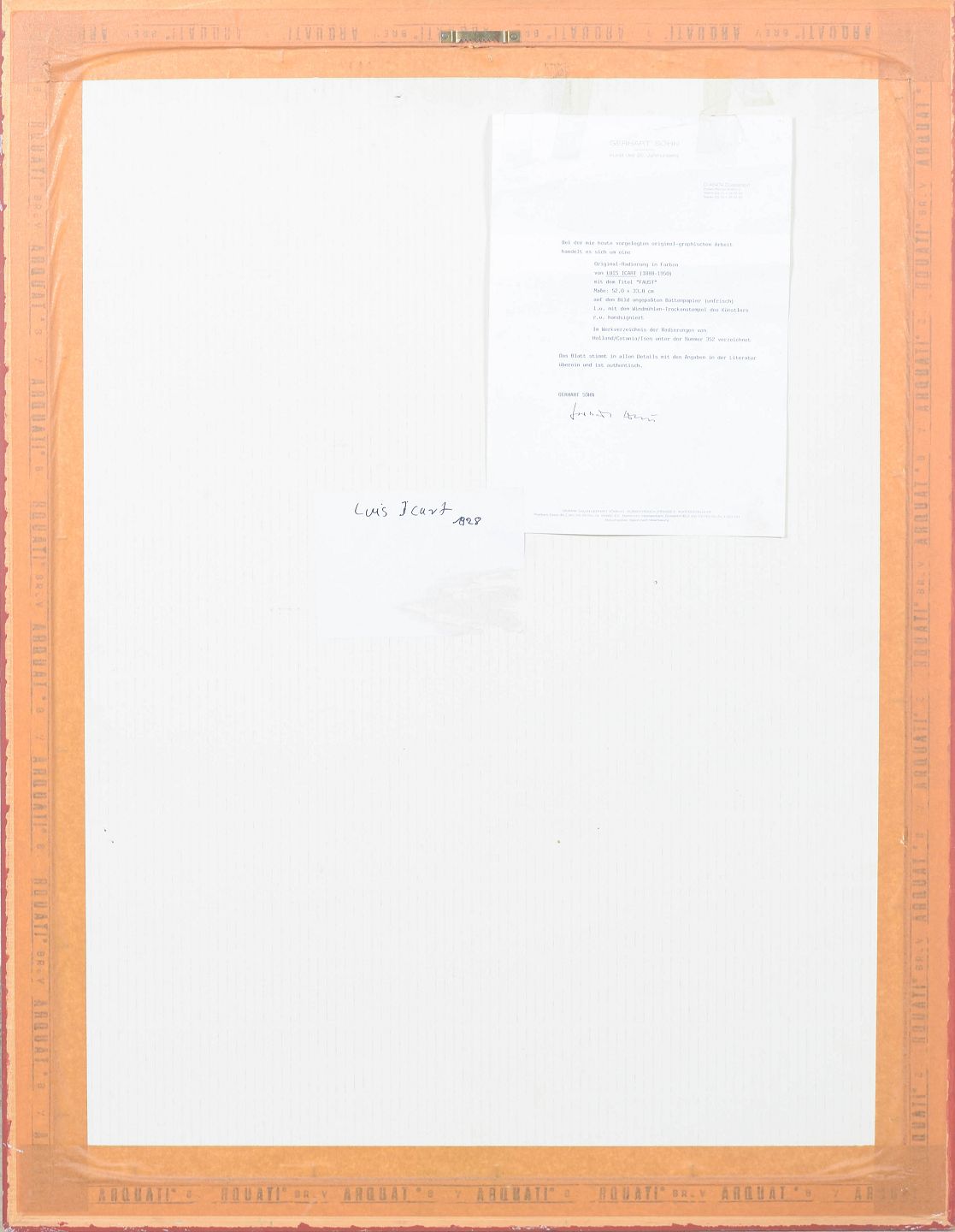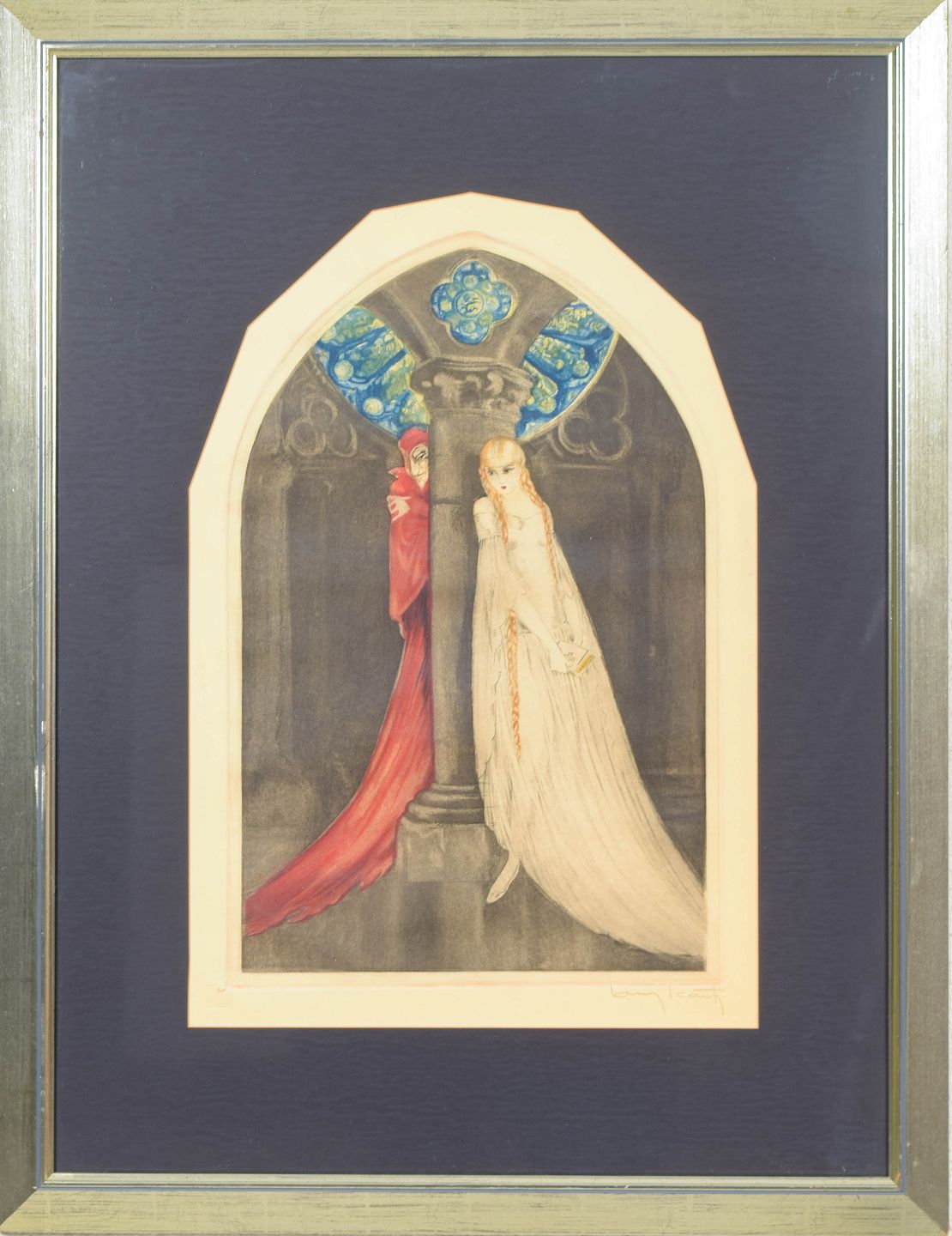 Elegant og stemningsfuld komposition med to figurer i arkitektonisk ramme, udført i Icart’s karakteristiske Art Deco stil med fine linjer og bløde farveovergange. Signeret i blyant og nummereret 70. Dateret 1928.