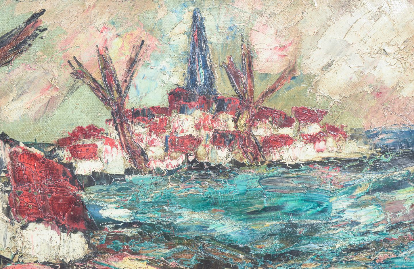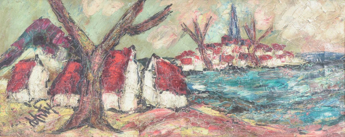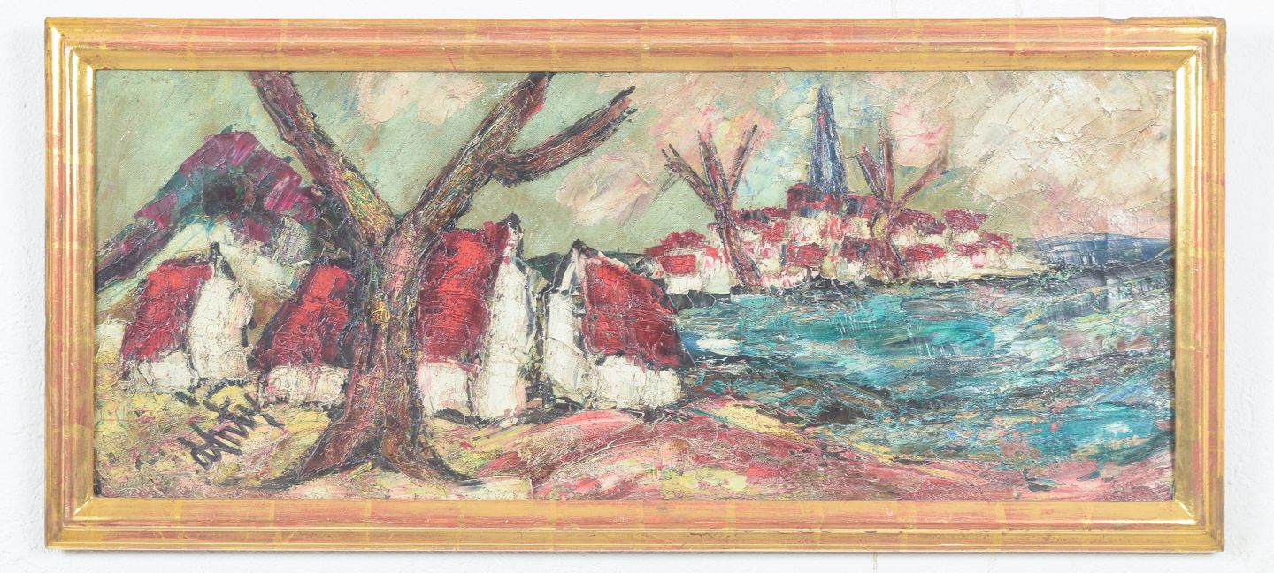 Ekspressivt landskab med bebyggelse og vand udført i kraftig, gestisk penselføring og tyk farvepåføring. Kompositionen har et abstrakt præg med klare farvekontraster og dynamisk struktur. Signeret.