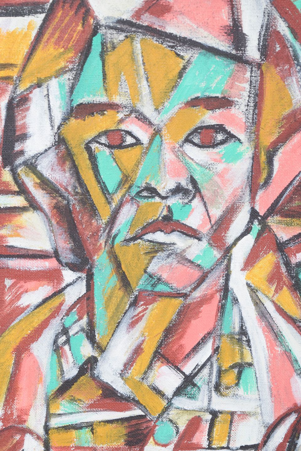 Farverig kubistisk inspireret figurkomposition med geometrisk opdelt motiv og ekspressiv penselføring, udført i olie på lærred. Usigneret.