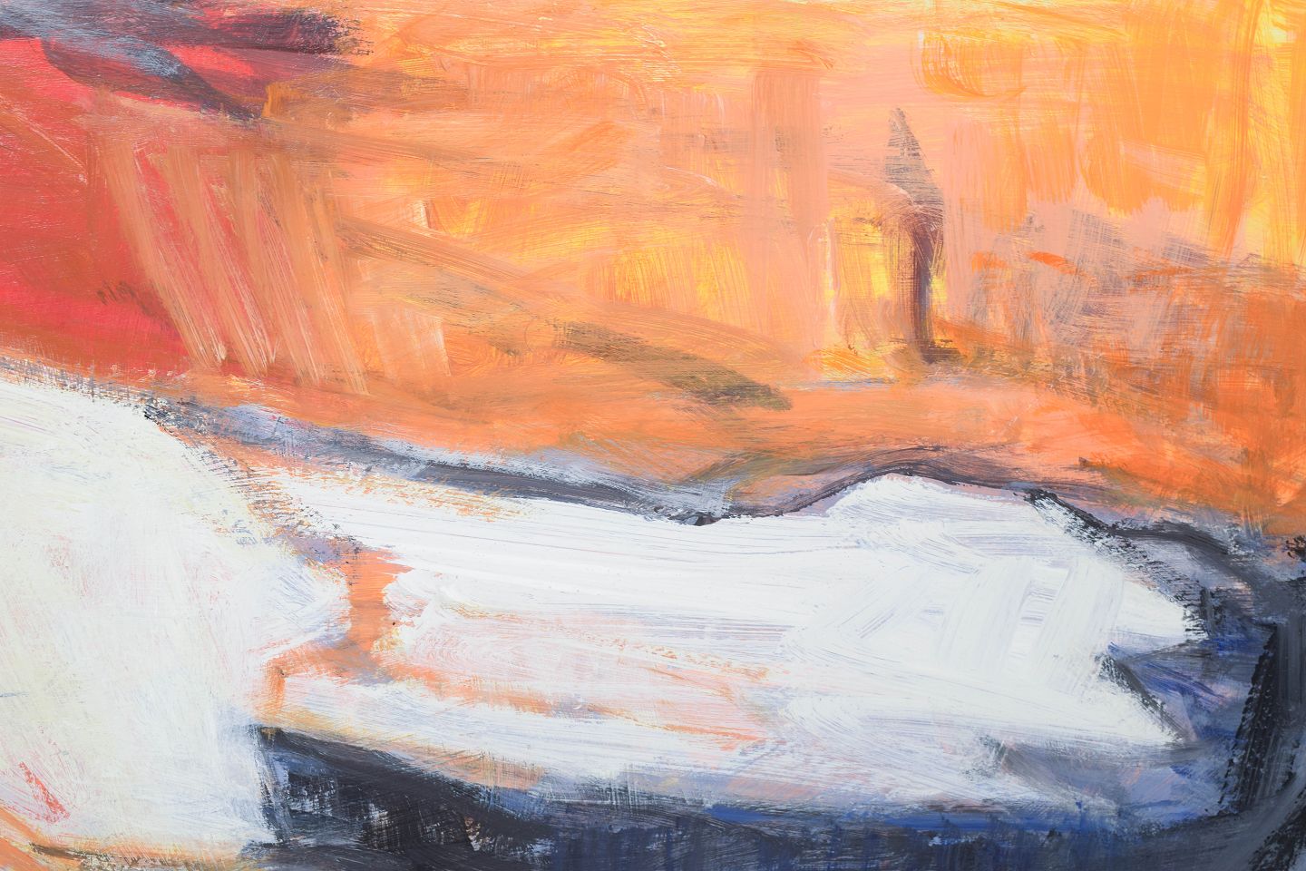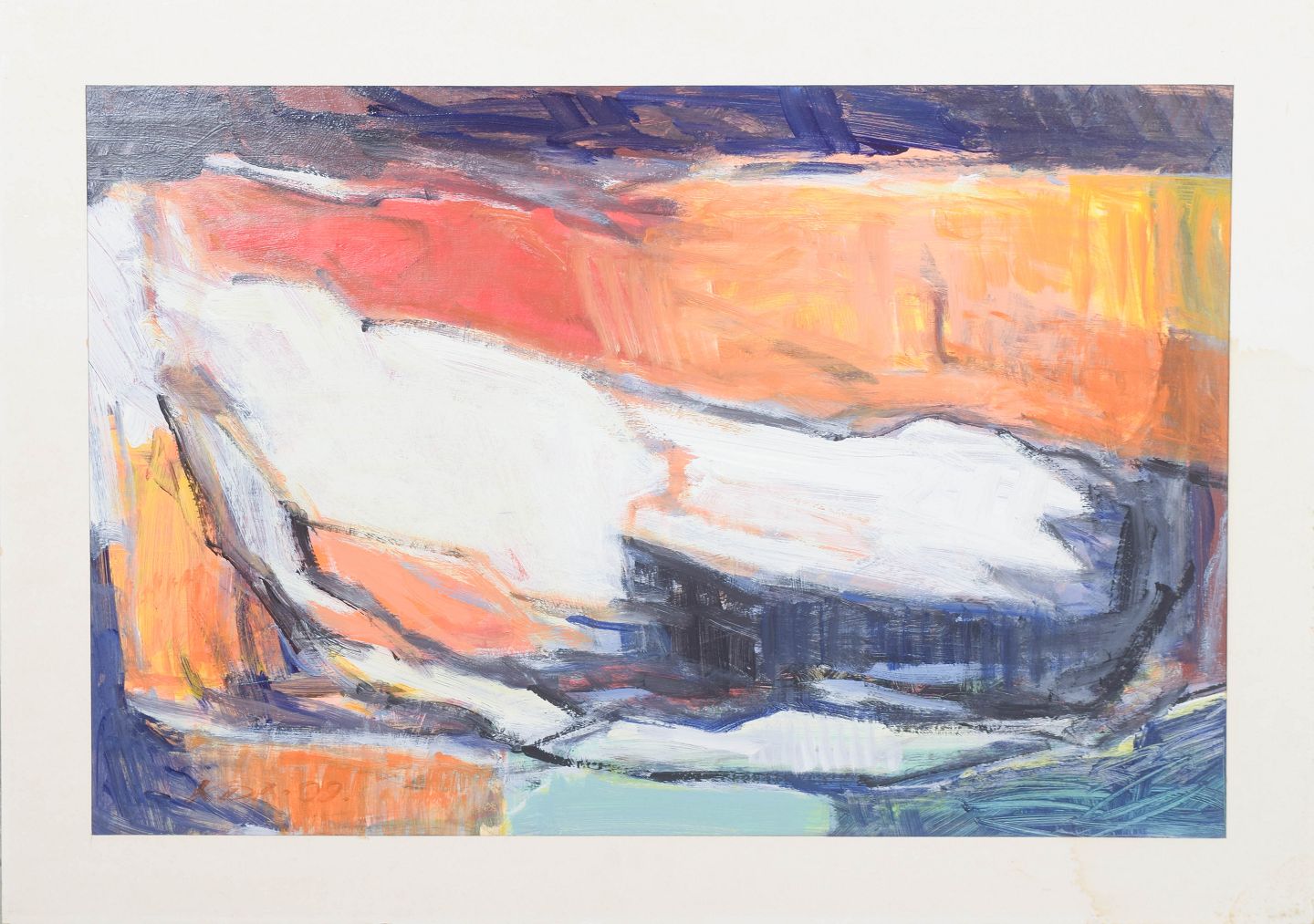 Abstrakt komposition udført med brede, ekspressive penselstrøg i en farveholdning domineret af varme orange og kølige blå nuancer. Motivet fremstår som en dynamisk fladeopbygning med lagdelte strukturer og bevægelige former. Signeret og dateret 1999.