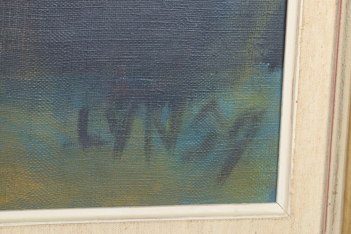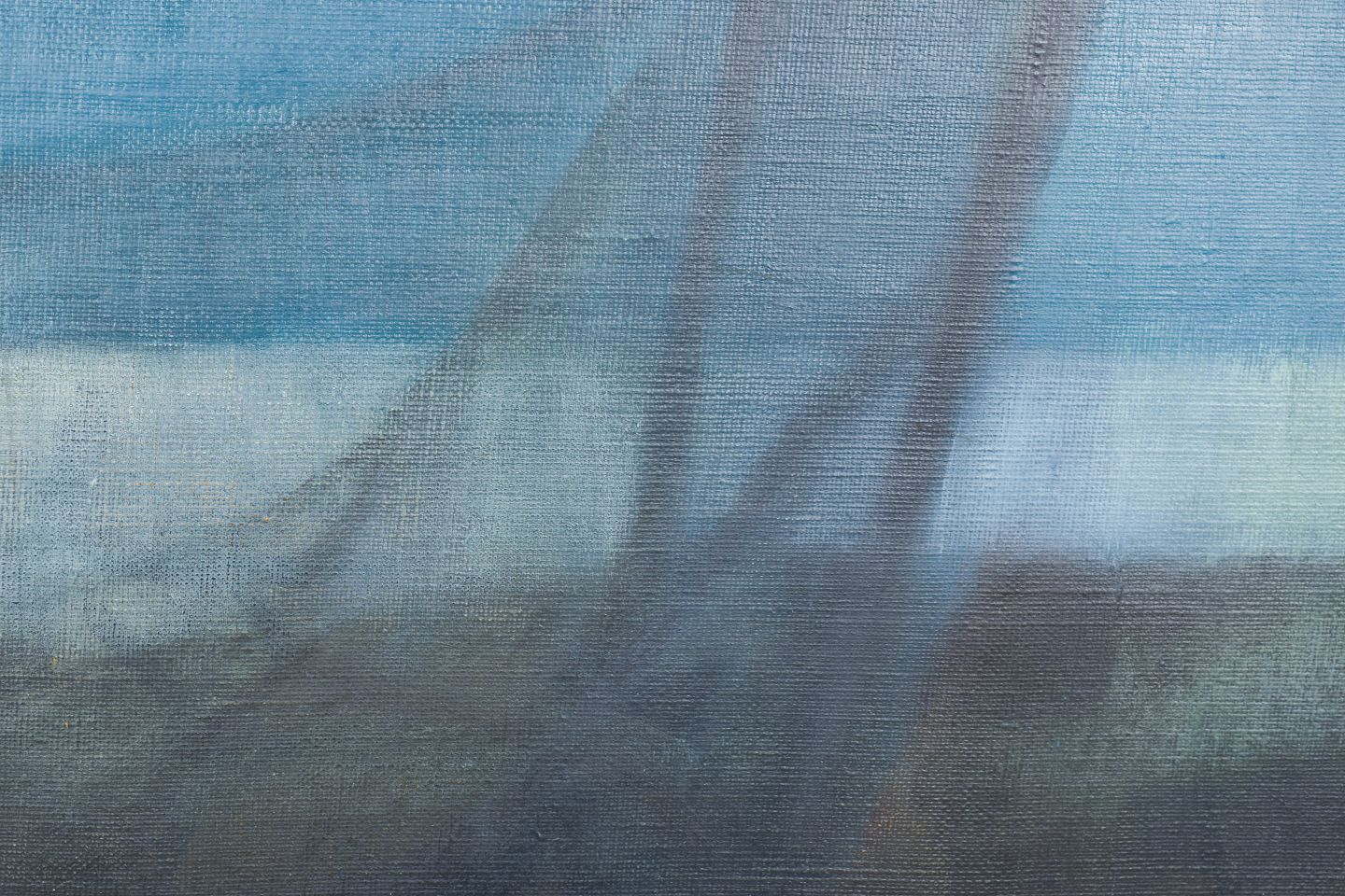 Modernistisk komposition med stiliseret landskabsmotiv, hvor mørke former og netstrukturer fremstår i en dæmpet og atmosfærisk farveholdning. Udført i olie på lærred, signeret og dateret 1959.