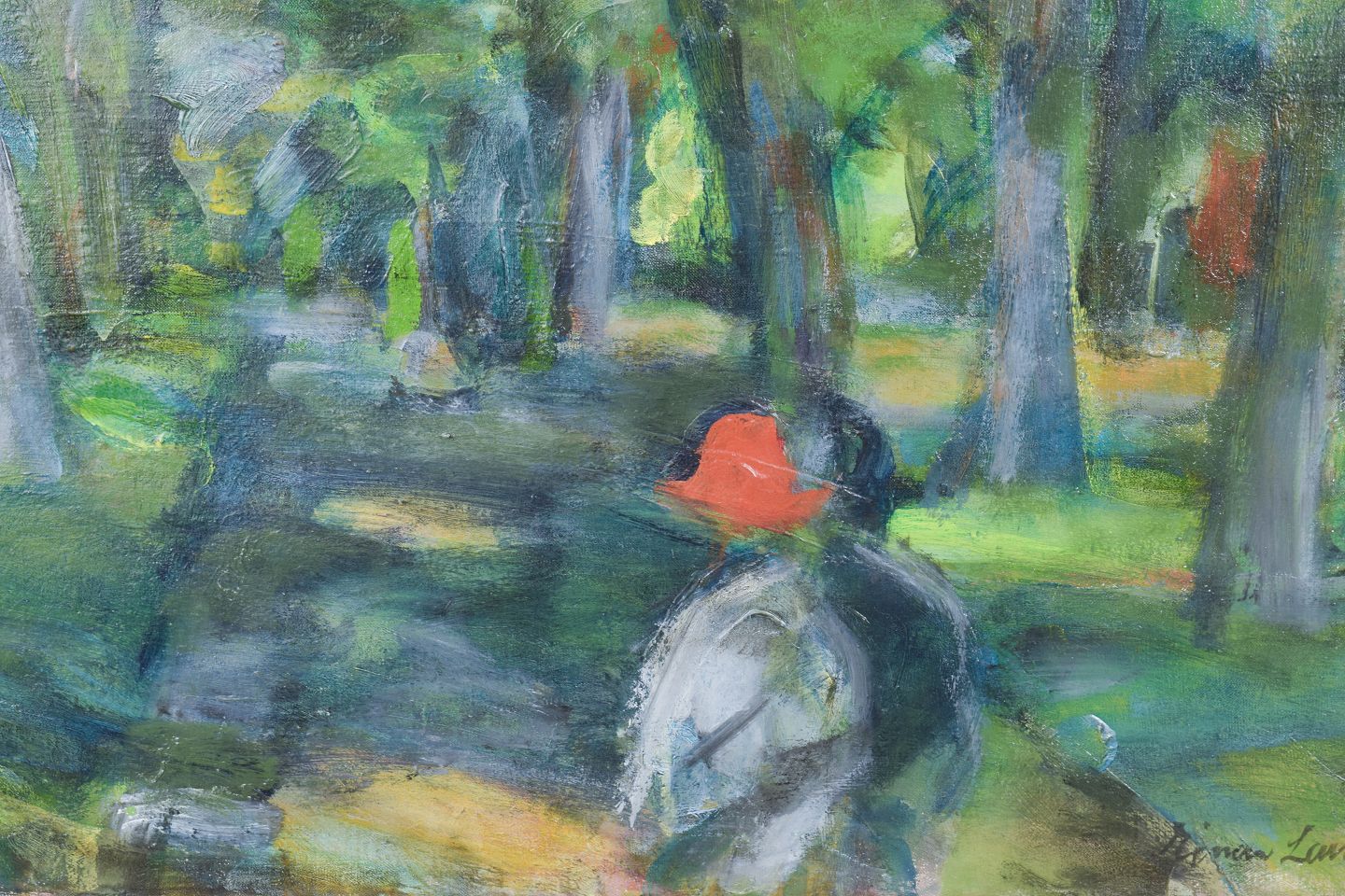 Modernistisk komposition med figurativt motiv i et skovlandskab, udført i en fri og let opløst penselføring med fokus på lys, farve og atmosfære. Signeret og dateret 1965.