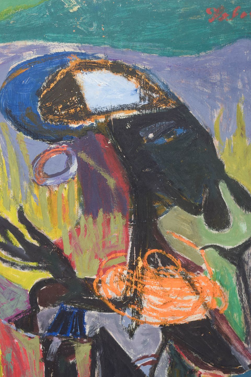 Ekspressivt og farverigt figurativt motiv med stiliseret fremstilling af kvindefigur udført i en abstrakt, modernistisk billedopbygning. Kompositionen er opbygget med kraftige konturer og kontrasterende farvefelter i klare og dybe nuancer. Signeret.