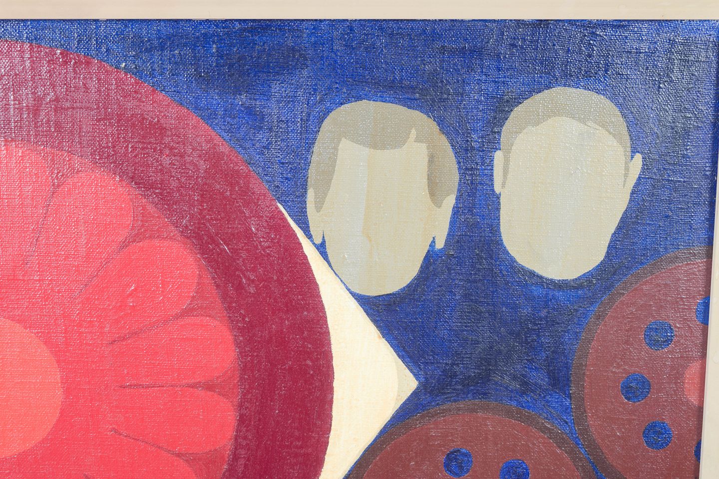 Surrealistisk komposition med stiliserede figurative og geometriske elementer i en afbalanceret og dekorativ opbygning, udført i klare farvefelter og med en drømmende, symbolsk karakter. Signeret og dateret 1969.