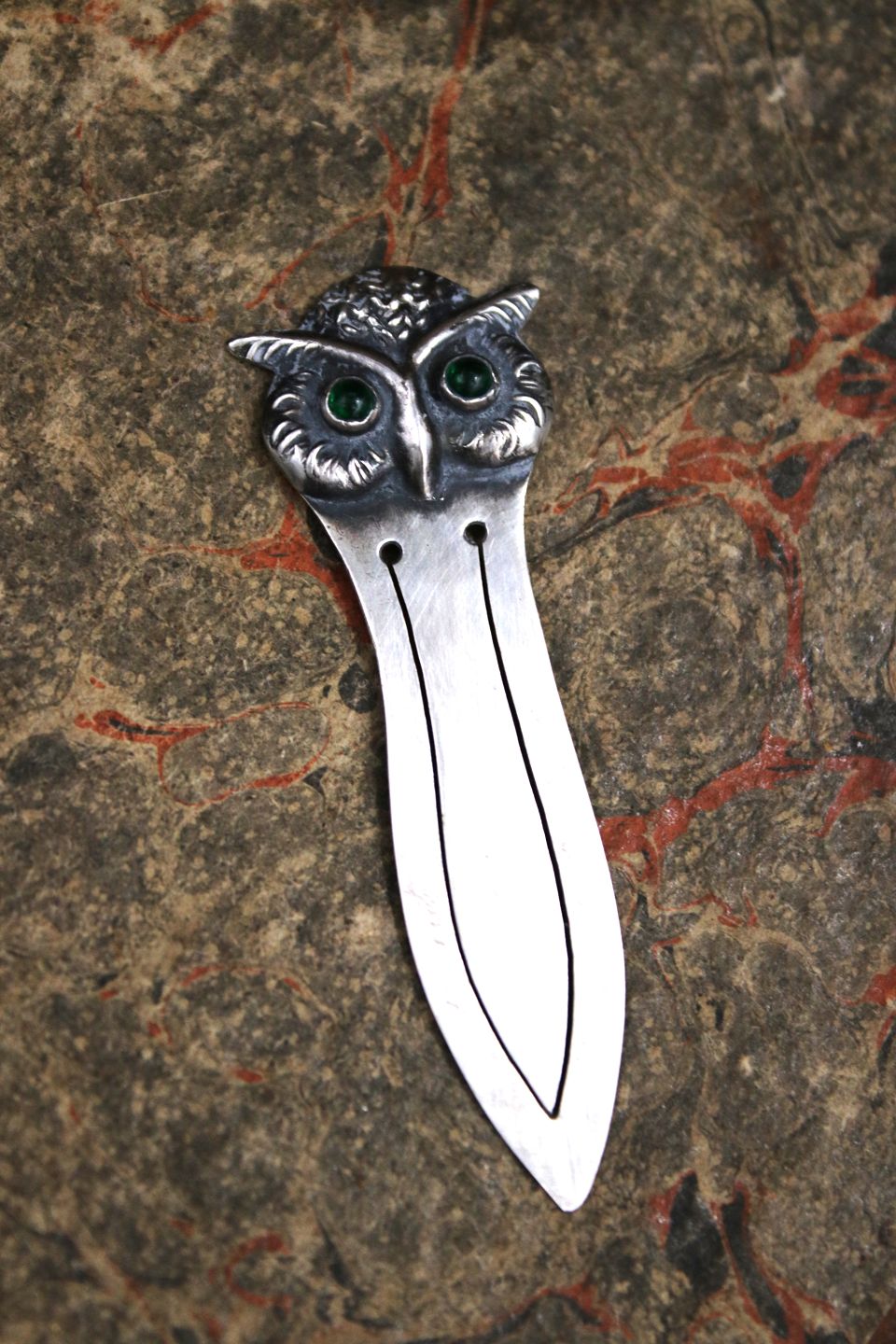 Gammelt bogmærke i sølv i form af en lille ugle med grønne glas øjne.
