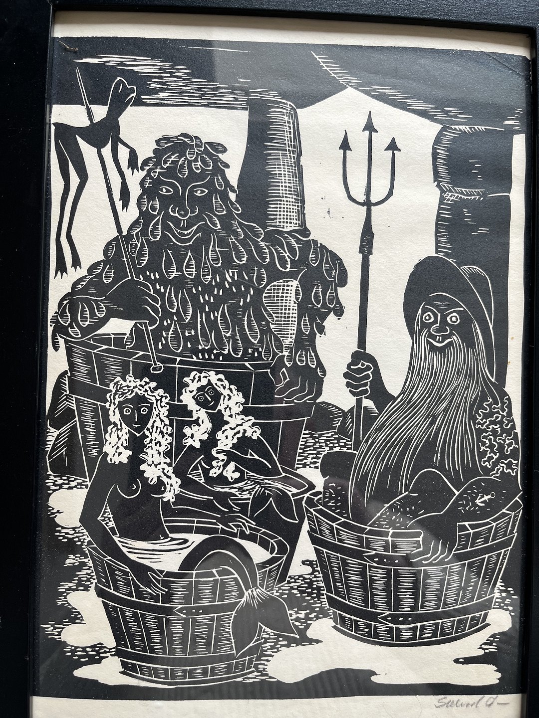 2 linoleumssnit af Svend P. Jørensen 1973.