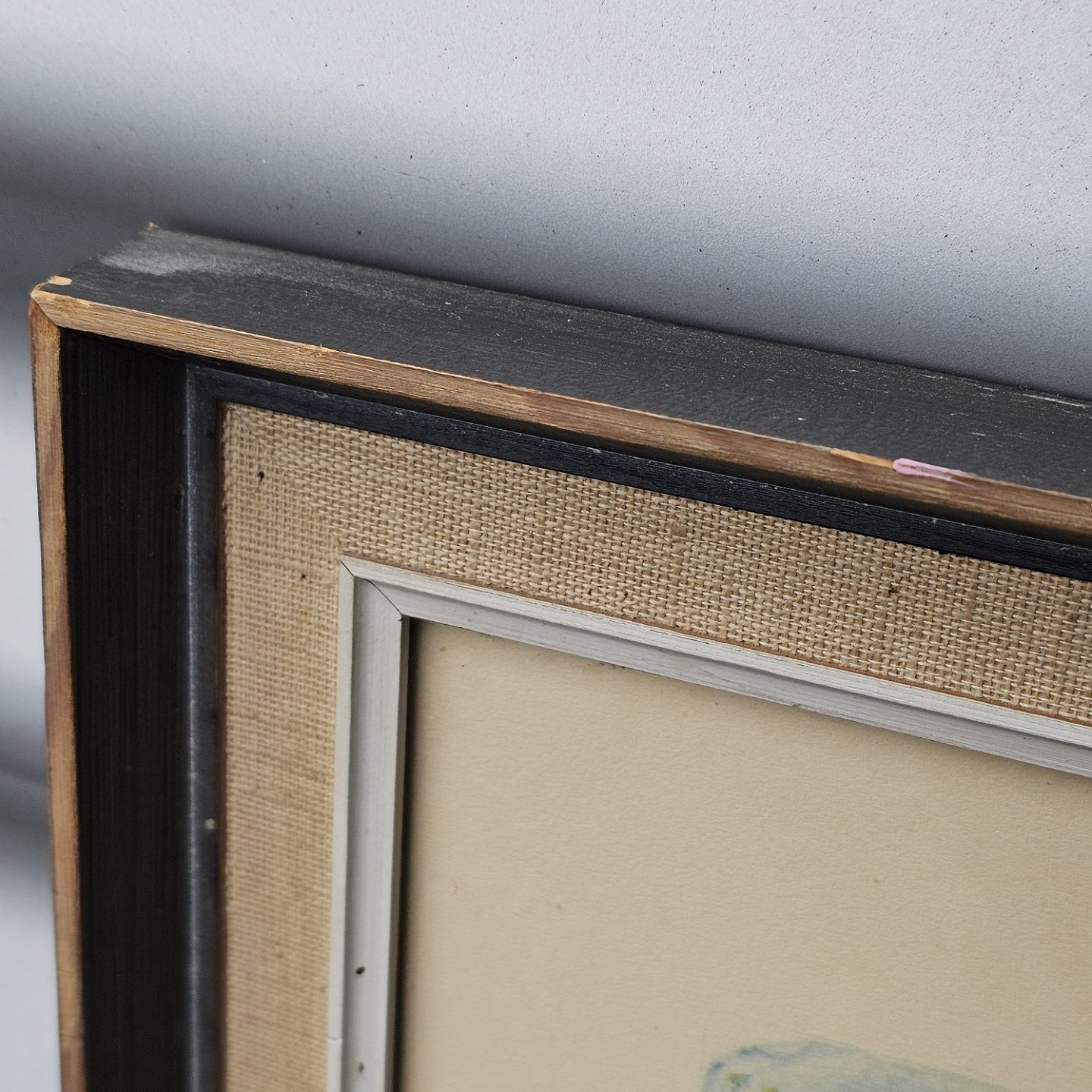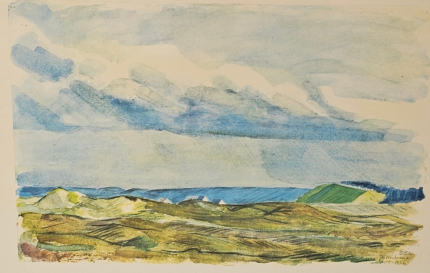 Akvarel maleri på papir med motiv af Slettestrand. Monteret i sortmalet træramme, dateret 1956
